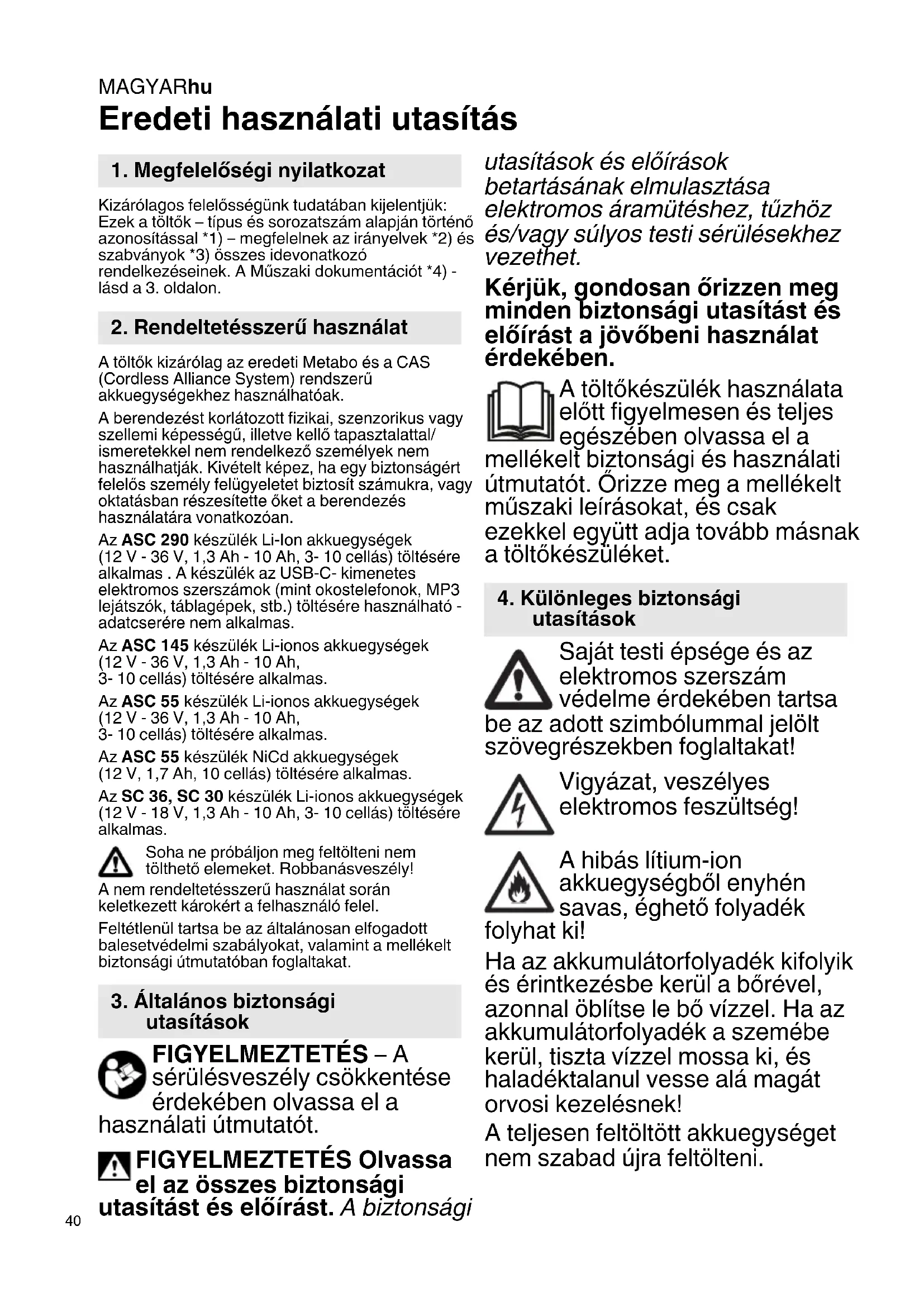 Eredeti használati utasítás Kizárólagos felelősségünk tudatában kijelentjük: Ezek a töltők – típus és sorozatszám alapján történő azonosítással *1) – megfelelnek az irányelvek *2) és szabványok *3) összes idevonatkozó rendelkezéseinek. A Műszaki dokumentációt *4) - lásd a 3. oldalon. A töltők kizárólag az eredeti Metabo és a CAS (Cordless Alliance System) rendszerű akkuegységekhez használhatóak. A berendezést korlátozott fizikai, szenzorikus vagy szellemi képességű, illetve kellő tapasztalattal/ ismeretekkel nem rendelkező személyek nem használhatják. Kivételt képez, ha egy biztonságért felelős személy felügyeletet biztosít számukra, vagy oktatásban részesítette őket a berendezés használatára vonatkozóan. Az ASC 290 készülék Li-Ion akkuegységek (12 V - 36 V, 1,3 Ah - 10 Ah, 3- 10 cellás) töltésére alkalmas . A készülék az USB-C- kimenetes elektromos szerszámok (mint okostelefonok, MP3 lejátszók, táblagépek, stb.) töltésére használható - adatcserére nem alkalmas. Az ASC 145 készülék Li-ionos akkuegységek (12 V - 36 V, 1,3 Ah - 10 Ah,