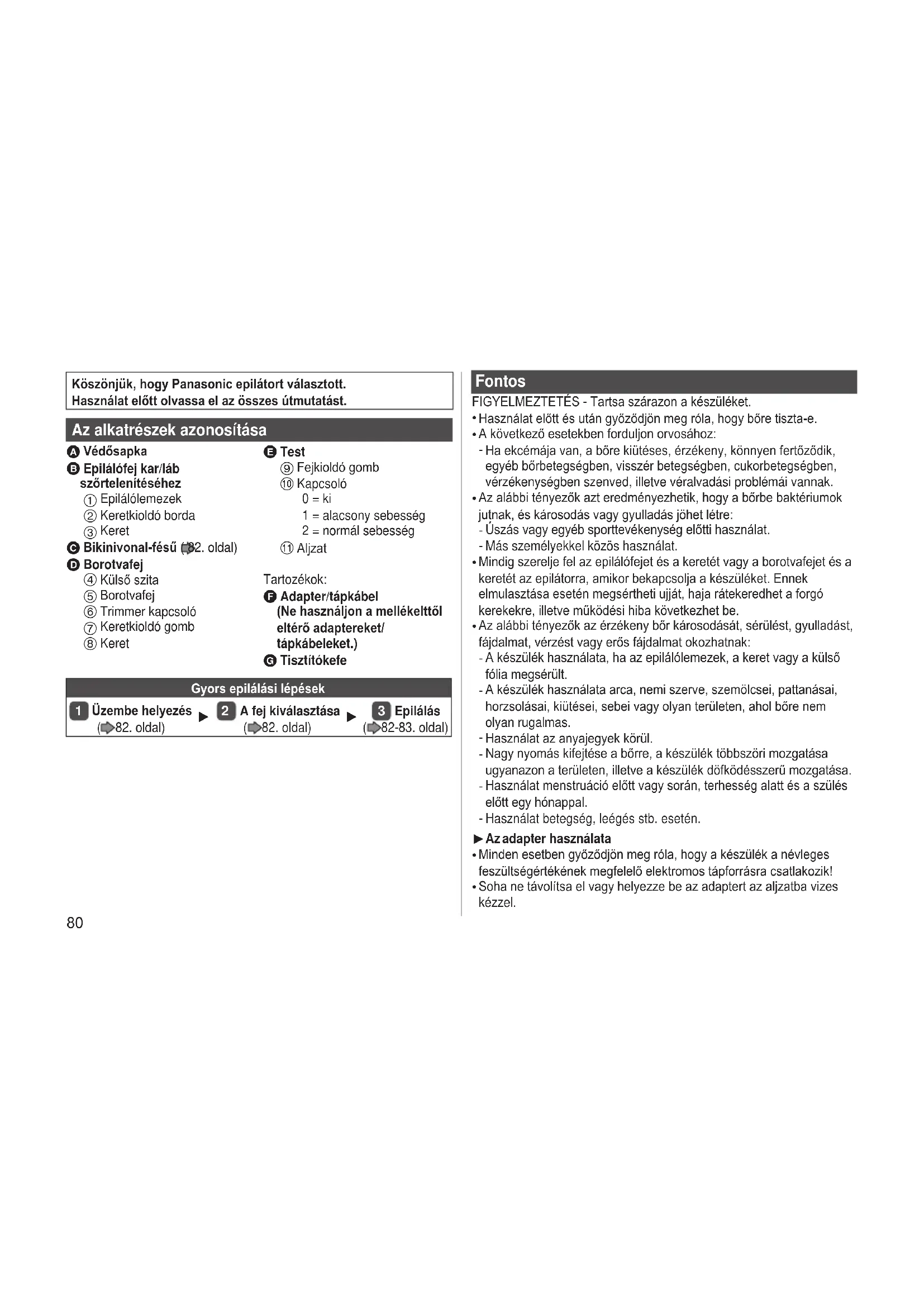 82-83. oldal) Fontos FIGYELMEZTETÉS - Tartsa szárazon a készüléket. Használat előtt és után győződjön meg róla, hogy bőre tiszta-e. A következő esetekben forduljon orvosához: Ha ekcémája van, a bőre kiütéses, érzékeny, könnyen fertőződik, egyéb bőrbetegségben, visszér betegségben, cukorbetegségben, vérzékenységben szenved, illetve véralvadási problémái vannak. Az alábbi tényezők azt eredményezhetik, hogy a bőrbe baktériumok jutnak, és károsodás vagy gyulladás jöhet létre: Úszás vagy egyéb sporttevékenység előtti használat. Más személyekkel közös használat. Mindig szerelje fel az epilálófejet és a keretét vagy a borotvafejet és a keretét az epilátorra, amikor bekapcsolja a készüléket. Ennek elmulasztása esetén megsértheti ujját, haja rátekeredhet a forgó kerekekre, illetve működési hiba következhet be. Az alábbi tényezők az érzékeny bőr károsodását, sérülést, gyulladást, fájdalmat, vérzést vagy erős fájdalmat okozhatnak: A készülék használata, ha az epilálólemezek, a keret vagy a külső fólia megsérült. A készülék használata arca, nemi szerve, szemölcsei, pattanásai, horzsolásai, kiütései, sebei vagy olyan területen, ahol bőre nem olyan rugalmas. Használat az anyajegyek körül. Nagy nyomás kifejtése a bőrre, a készülék többszöri mozgatása ugyanazon a területen, illetve a készülék döfködésszerű mozgatása. Használat menstruáció előtt vagy során, terhesség alatt és a szülés előtt egy hónappal. Használat betegség, leégés stb. esetén.