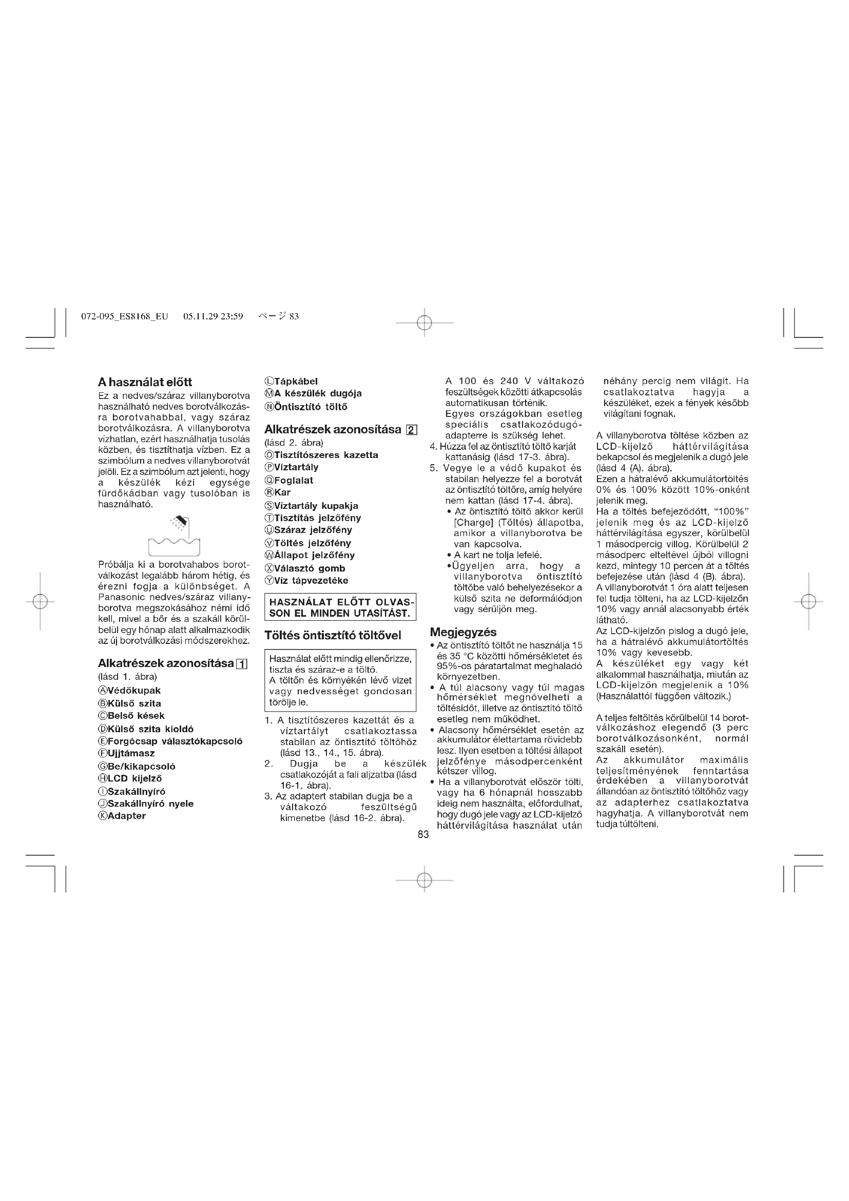 A használat előtt Ez a nedves/száraz villanyborotva használható nedves borotválkozás- ra borotvahabbal, vagy száraz borotválkozásra. A villanyborotva vízhatlan, ezért használhatja tusolás közben, és tisztíthatja vízben. Ez a szimbólum a nedves villanyborotvát jelöli. Ez a szimbólum azt jelenti, hogy a készülék kézi egysége fürdőkádban vagy tusolóban is használható. Próbálja ki a borotvahabos borot- válkozást legalább három hétig, és érezni fogja a különbséget. A Panasonic nedves/száraz villany- borotva megszokásához némi idő kell, mivel a bőr és a szakáll körül- belül egy hónap alatt alkalmazkodik az új borotválkozási módszerekhez. Alkatrészek azonosítása