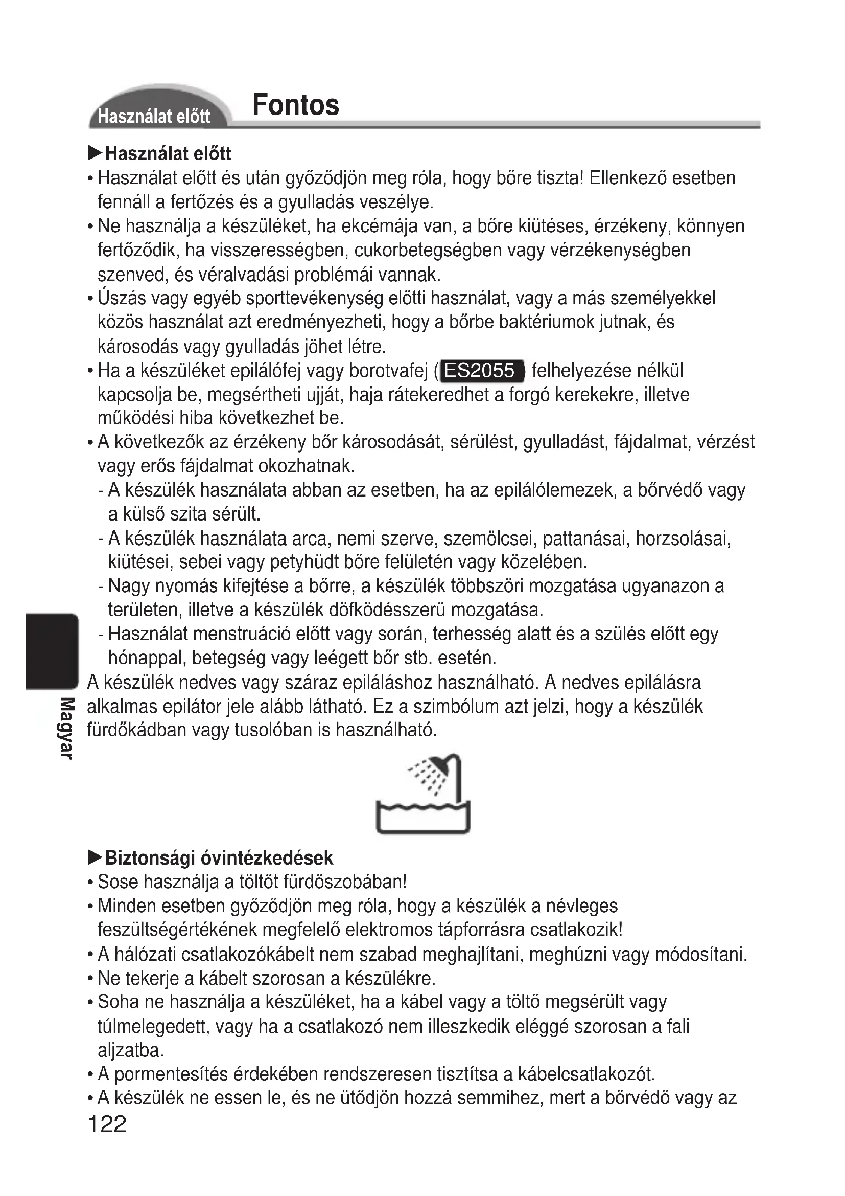 Buton de eliberare a cadrului Accesorii: Încărcător (RE7- 44), perie de curăţare şi pungă. (Vă rugăm să nu folosiţi alte accesorii decât cele furnizate.)122 Magyar Fontos Használatelőtt 1Használatelőtt Használat előtt és után győződjön meg róla, hogy bőre tiszta! Ellenkező esetben fennáll a fertőzés és a gyulladás veszélye. Ne használja a készüléket, ha ekcémája van, a bőre kiütéses, érzékeny, könnyen fertőződik, ha visszerességben, cukorbetegségben vagy vérzékenységben szenved, és véralvadási problémái vannak. Úszás vagy egyéb sporttevékenység előtti használat, vagy a más személyekkel közös használat azt eredményezheti, hogy a bőrbe baktériumok jutnak, és károsodás vagy gyulladás jöhet létre. Ha a készüléket epilálófej vagy borotvafej ( ES2055 ) felhelyezése nélkül kapcsolja be, megsértheti ujját, haja rátekeredhet a forgó kerekekre, illetve működési hiba következhet be. A következők az érzékeny bőr károsodását, sérülést, gyulladást, fájdalmat, vérzést vagy erős fájdalmat okozhatnak. A készülék használata abban az esetben, ha az epilálólemezek, a bőrvédő vagy a külső szita sérült. A készülék használata arca, nemi szerve, szemölcsei, pattanásai, horzsolásai, kiütései, sebei vagy petyhüdt bőre felületén vagy közelében. Nagy nyomás kifejtése a bőrre, a készülék többszöri mozgatása ugyanazon a területen, illetve a készülék döfködésszerű mozgatása. Használat menstruáció előtt vagy során, terhesség alatt és a szülés előtt egy hónappal, betegség vagy leégett bőr stb. esetén. A készülék nedves vagy száraz epiláláshoz használható. A nedves epilálásra alkalmas epilátor jele alább látható. Ez a szimbólum azt jelzi, hogy a készülék fürdőkádban vagy tusolóban is használható. 1Biztonsági óvintézkedések Sose használja a töltőt fürdőszobában! Minden esetben győződjön meg róla, hogy a készülék a névleges feszültségértékének megfelelő elektromos tápforrásra csatlakozik! A hálózati csatlakozókábelt nem szabad meghajlítani, meghúzni vagy módosítani. Ne tekerje a kábelt szorosan a készülékre. Soha ne használja a készüléket, ha a kábel vagy a töltő megsérült vagy túlmelegedett, vagy ha a csatlakozó nem illeszkedik eléggé szorosan a fali aljzatba. A pormentesítés érdekében rendszeresen tisztítsa a kábelcsatlakozót. A készülék ne essen le, és ne ütődjön hozzá semmihez, mert a bőrvédő vagy az