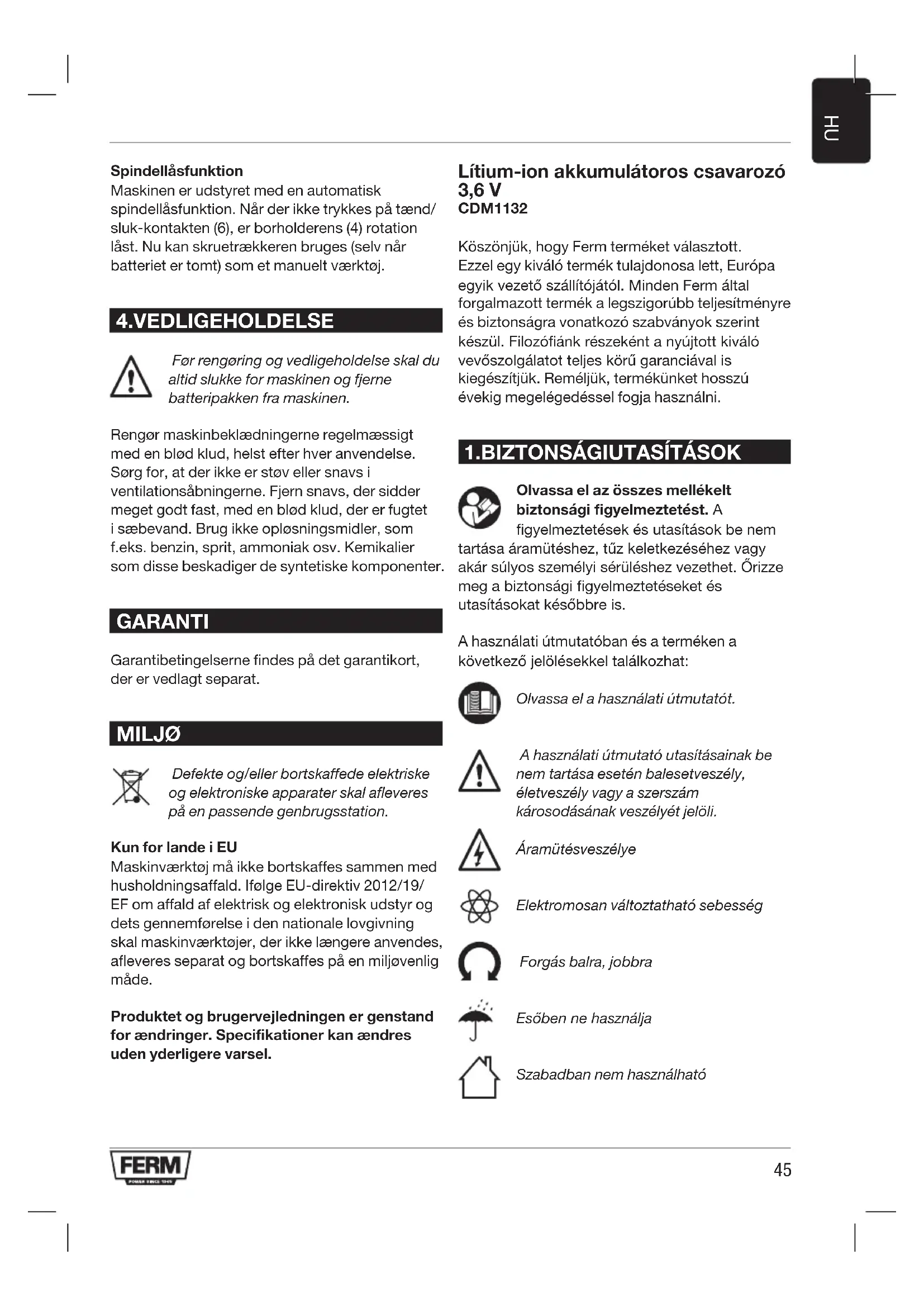 Az akkumulátort tűzbe dobni tilos Az akkumulátort vízbe dobni tilos A terméket hulladékként ne tegye arra nem alkalmas konténerbe. A Lítium-ionos akkumulátort külön kell begyűjteni. A termék megfelel az európai irányelvek rá vonatkozó biztonsági követelményeinek. További munkavédelmi figyelmezteté- sek fúrók és csavarozók esetén a) Viseljen hallásvédelmet ütvefúráskor. A magas zajszint halláskárosodást okozhat. b) Használja a kiegészítő fogantyú(ka)t, ha van a géphez. A gép feletti uralom elvesztése balesetet okozhat. c) Az elektromos szerszámot a szigetelt markolatainál fogja, amikor olyan helyen dolgozik vele, ahol a kötőelem rejtett vezetéket érhet. Ha a kötőelem feszültség alatt álló vezetékhez ér, a szerszám szabadon álló fémes részei feszültség alá kerülhetnek, és a kezelő áramütést szenvedhet. Az akkumulátoros szerszám használata és ápolása a) Újratöltéshez csak a gyártó által megjelölt töltőt használja.. Az egyik akkumulátorhoz megfelelő töltő másikfajta töltővel használva tűzveszélyes lehet. b) Csak a kifejezetten hozzájuk készült akkumulátorral használja a villamos kéziszerszámot. Bármilyen másfajta akkumulátor használata tűz- és balesetveszélyt idézhet elő. c) Amikor az akkumulátor nincs használatban, óvja olyan más fém tárgyaktól, mint a gémkapocs, a pénzérme, kulcs, szög, csavar és más kis fém tárgyak, amely a két kapcsot össze képes kötni. Az akkumulátor kapcsok rövidre zárása égési sérülést vagy tüzet okozhat. d) Agresszív körülmények között az akkumulátorból folyadék kerülhet ki; kerülje a vele való érintkezést. Ha véletlenül mégis a bőrre kerül, vízzel öblítse le. Ha a folyadék szembe kerül, forduljon orvoshoz is.. Az akkumulátorból származó folyadék bőrizgató hatású, égési sérülést is okozhat. e) A beépített akkumulátorokat kiselejtezéskor csak képzett szakember szerelheti ki. Szerviz a) A villamos kéziszerszámot képzett javító szakemberrel javíttassa, csakis az eredetivel azonos pótalkatrészeket használjon fel. Ez biztosítja, hogy a villamos kéziszerszám továbbra is biztonságos marad. A töltőről Rendeltetése Csak 3,6 V max. 1,3 Ah Li-ion típusú újratölthető elemkötegeket használjon. Másfajta elemek használata személyi sérülést és károkat okozhat. a) A villamos készüléket csökkent zikai, érzékszervi vagy szellemi képességű személyek (gyermekeket is ideértve) vagy tapasztalat, ismeret híján csak felügyelet vagy útmutatás mellett használhatják. Figyelni kell, nehogy a gyerekek játszanak a készülékkel b) Nem újratölthető elemek újratöltésével próbálkozni tilos! c) Az akkumulátorok töltését jól szellőző helyen kell végezni.47