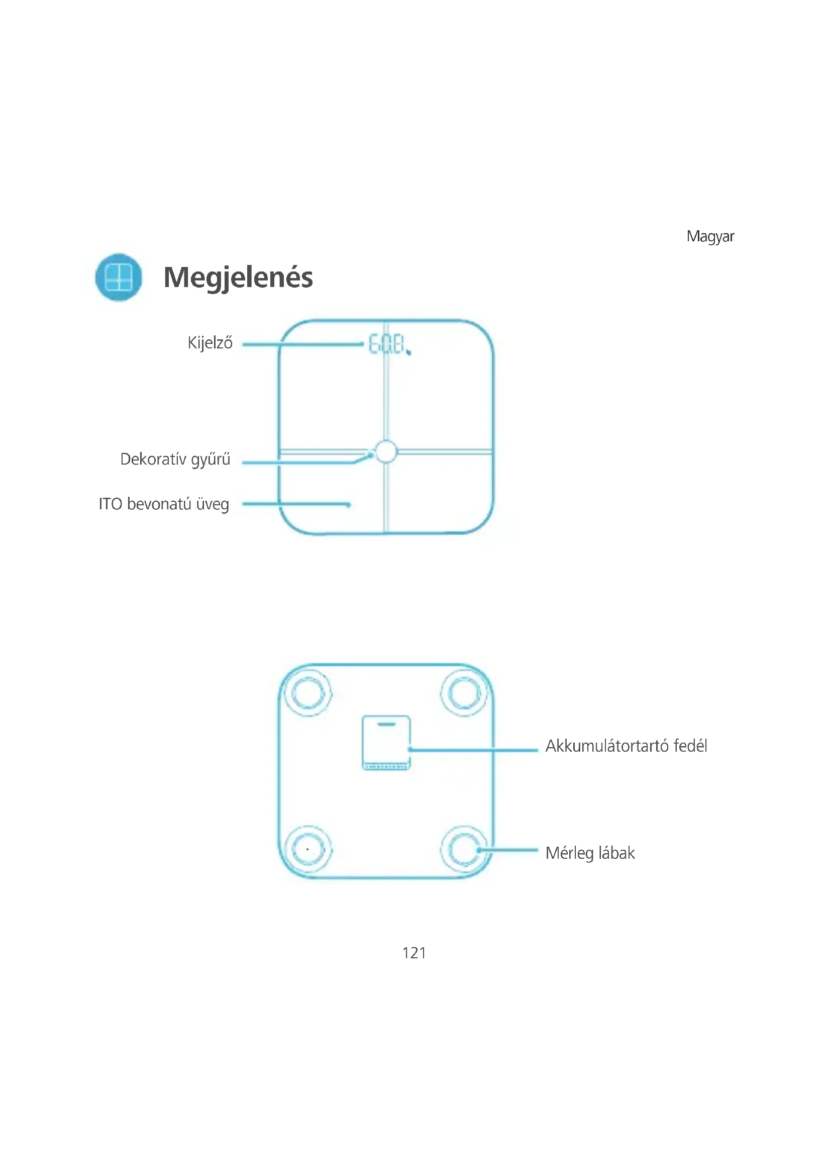Megjelenés Kijelző Dekoratív gyűrű ITO bevonatú üveg Mérleg lábak Akkumulátortartó fedél122