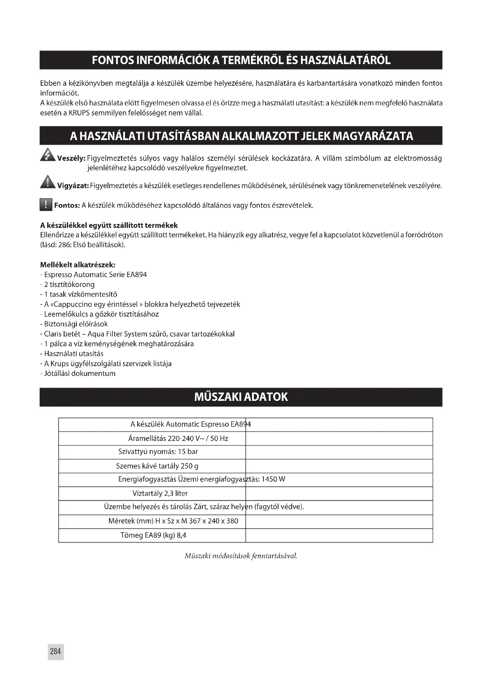 Fontos: A készülék működéséhez kapcsolódó általános vagy fontos észrevételek. A készülékkel együtt szállított termékek Ellenőrizze a készülékkel együtt szállított termékeket. Ha hiányzik egy alkatrész, vegye fel a kapcsolatot közvetlenül a forródróton (lásd: 286: Első beállítások). Mellékelt alkatrészek: - Espresso Automatic Serie EA894 - 2 tisztítókorong - 1 tasak vízkőmentesítő - A «Cappuccino egy érintéssel » blokkra helyezhető tejvezeték - Leemelőkulcs a gőzkör tisztításához - Biztonsági előírások - Claris betét – Aqua Filter System szűrő, csavar tartozékokkal - 1 pálca a víz keménységének meghatározására - Használati utasítás - A Krups ügyfélszolgálati szervizek listája - Jótállási dokumentum
