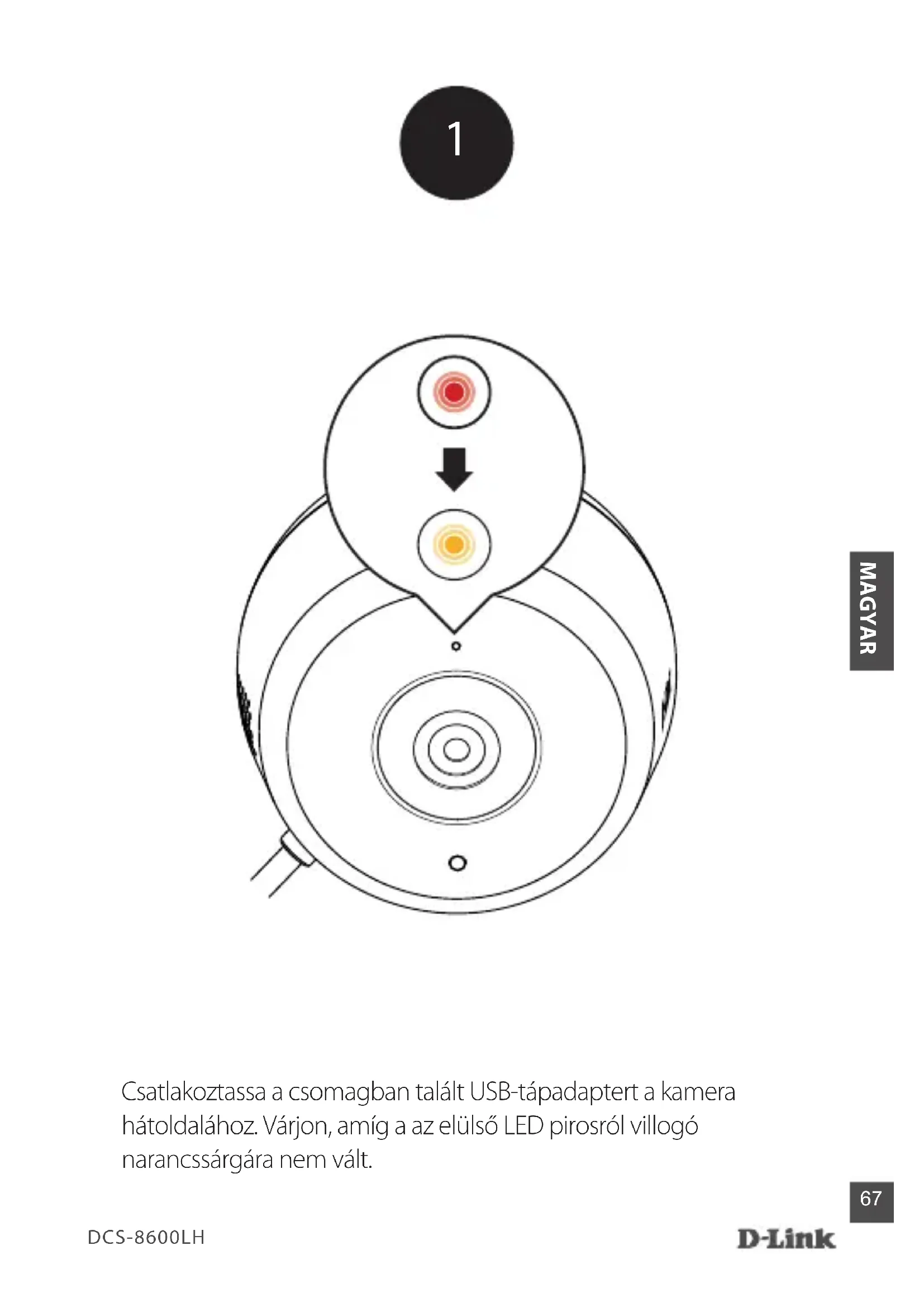 Csatlakoztassa a csomagban talált USB-tápadaptert a kamera hátoldalához. Várjon, amíg a az elülső LED pirosról villogó narancssárgára nem vált.DCS-8600LH