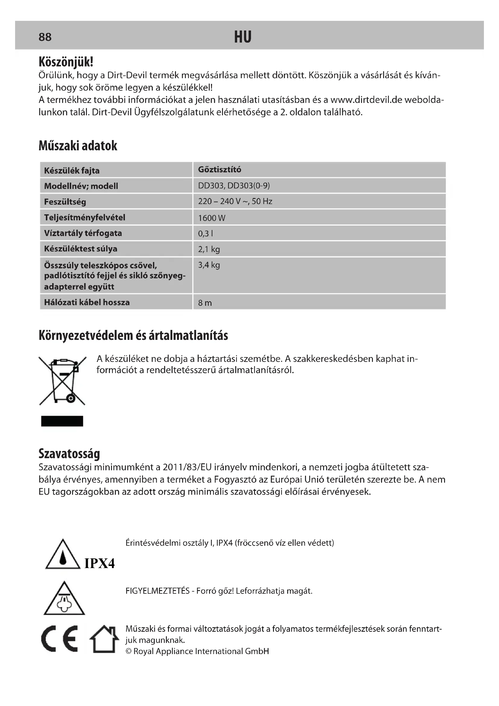 87IPX4 Környezetvédelem és ártalmatlanítás A készüléket ne dobja a háztartási szemétbe. A szakkereskedésben kaphat in- formációt a rendeltetésszerű ártalmatlanításról. Szavatosság Szavatossági minimumként a 2011/83/EU irányelv mindenkori, a nemzeti jogba átültetett sza- bálya érvényes, amennyiben a terméket a Fogyasztó az Európai Unió területén szerezte be. A nem EU tagországokban az adott ország minimális szavatossági előírásai érvényesek. Műszaki és formai változtatások jogát a folyamatos termékfejlesztések során fenntart-juk magunknak.© Royal Appliance International GmbH Köszönjük! Örülünk, hogy a Dirt-Devil termék megvásárlása mellett döntött. Köszönjük a vásárlását és kíván- juk, hogy sok öröme legyen a készülékkel! A termékhez további információkat a jelen használati utasításban és a www.dirtdevil.de webolda- lunkon talál. Dirt-Devil Ügyfélszolgálatunk elérhetősége a 2. oldalon található. Műszaki adatok Készülék fajtaGőztisztítóModellnév; modellDD303, DD303(0-9)Feszültség220 – 240 V ~, 50 HzTeljesítményfelvétel1600 WVíztartály térfogata0,3 lKészüléktest súlya2,1 kgÖsszsúly teleszkópos csővel, padlótisztító fejjel és sikló szőnyeg-adapterrel együtt3,4 kgHálózati kábel hossza 8 m FIGYELMEZTETÉS - Forró gőz! Leforrázhatja magát.Érintésvédelmi osztály I, IPX4 (fröccsenő víz ellen védett)