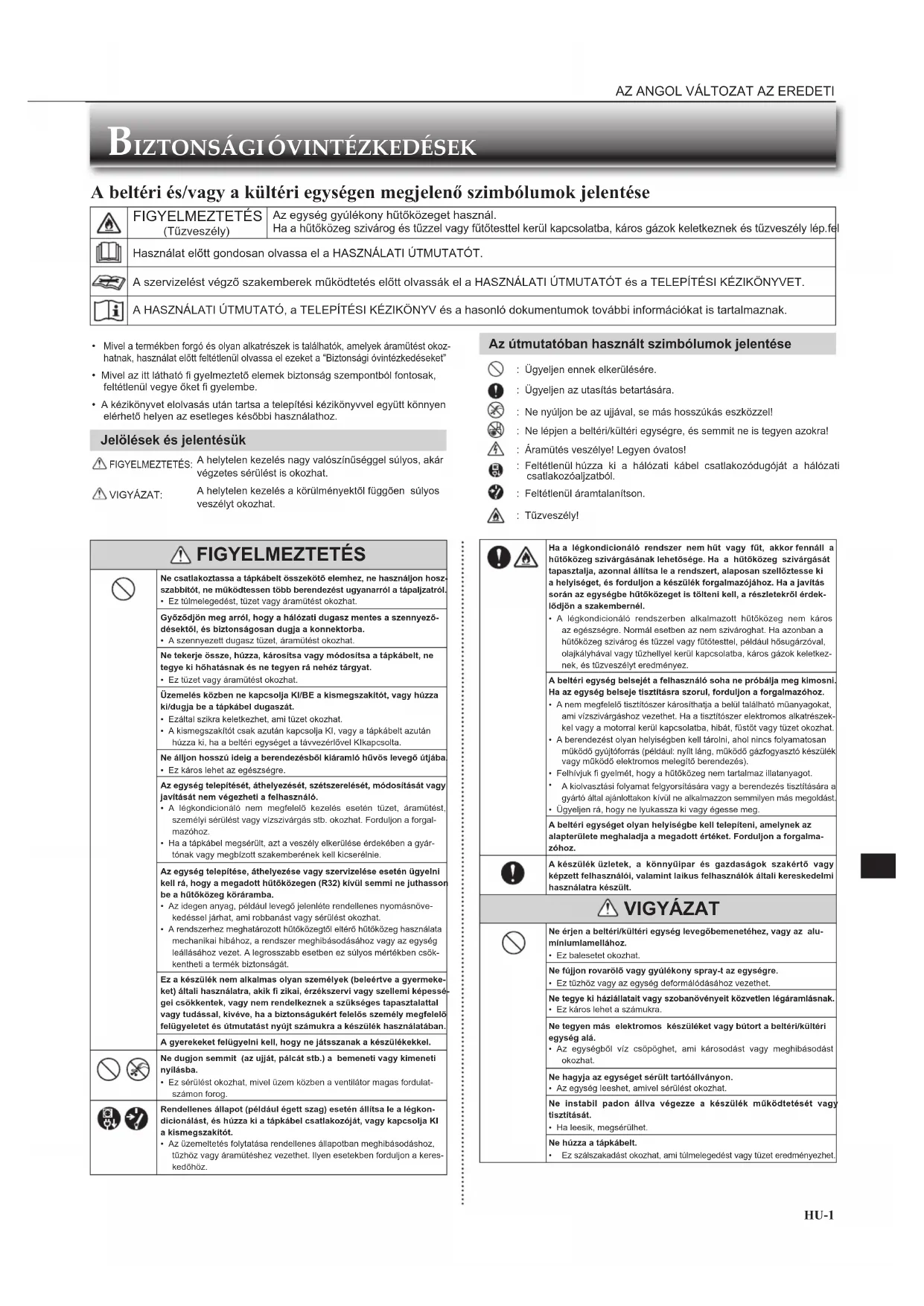 - Mivel az itt látható fi gyelmeztető elemek biztonság szempontból fontosak, feltétlenül vegye őket fi gyelembe.• A kézikönyvet elolvasás után tartsa a telepítési kézikönyvvel együtt könnyen elérhető helyen az esetleges későbbi használathoz. Jelölések és jelentésük FIGYELMEZTETÉS:A helytelen kezelés nagy valószínűséggel súlyos, akár végzetes sérülést is okozhat. VIGYÁZAT:A helytelen kezelés a körülményektől függően súlyos veszélyt okozhat. Ha a légkondicionáló rendszer nem hűt vagy fűt, akkor fennáll a hűtőközeg szivárgásának lehetősége. Ha a hűtőközeg szivárgását tapasztalja, azonnal állítsa le a rendszert, alaposan szellőztesse ki a helyiséget, és forduljon a készülék forgalmazójához. Ha a javítás során az egységbe hűtőközeget is tölteni kell, a részletekről érdek-lődjön a szakembernél.• A légkondicionáló rendszerben alkalmazott hűtőközeg nem káros az egészségre. Normál esetben az nem szivároghat. Ha azonban a hűtőközeg szivárog és tűzzel vagy fűtőtesttel, például hősugárzóval, olajkályhával vagy tűzhellyel kerül kapcsolatba, káros gázok keletkez-nek, és tűzveszélyt eredményez.A beltéri egység belsejét a felhasználó soha ne próbálja meg kimosni. Ha az egység belseje tisztításra szorul, forduljon a forgalmazóhoz.• A nem megfelelő tisztítószer károsíthatja a belül található műanyagokat, ami vízszivárgáshoz vezethet. Ha a tisztítószer elektromos alkatrészek-kel vagy a motorral kerül kapcsolatba, hibát, füstöt vagy tüzet okozhat.• A berendezést olyan helyiségben kell tárolni, ahol nincs folyamatosan működő gyújtóforrás (például: nyílt láng, működő gázfogyasztó készülék vagy működő elektromos melegítő berendezés).• Felhívjuk fi gyelmét, hogy a hűtőközeg nem tartalmaz illatanyagot. A kiolvasztási folyamat felgyorsítására vagy a berendezés tisztítására a gyártó által ajánlottakon kívül ne alkalmazzon semmilyen más megoldást.• Ügyeljen rá, hogy ne lyukassza ki vagy égesse meg.A beltéri egységet olyan helyiségbe kell telepíteni, amelynek az alapterülete meghaladja a megadott értéket. Forduljon a forgalma-zóhoz.A készülék üzletek, a könnyűipar és gazdaságok szakértő vagy képzett felhasználói, valamint laikus felhasználók általi kereskedelmi használatra készült. VIGYÁZAT Ne érjen a beltéri/kültéri egység levegőbemenetéhez, vagy az alu-míniumlamellához.• Ez balesetet okozhat.Ne fújjon rovarölő vagy gyúlékony spray-t az egységre.• Ez tűzhöz vagy az egység deformálódásához vezethet.Ne tegye ki háziállatait vagy szobanövényeit közvetlen légáramlásnak.• Ez káros lehet a számukra.Ne tegyen más elektromos készüléket vagy bútort a beltéri/kültéri egység alá.• Az egységből víz csöpöghet, ami károsodást vagy meghibásodást okozhat.Ne hagyja az egységet sérült tartóállványon.• Az egység leeshet, amivel sérülést okozhat.Ne instabil padon állva végezze a készülék működtetését vagy tisztítását.• Ha leesik, megsérülhet.Ne húzza a tápkábelt. Ez szálszakadást okozhat, ami túlmelegedést vagy tüzet eredményezhet. Az útmutatóban használt szimbólumok jelentése : Ügyeljen ennek elkerülésére. : Ügyeljen az utasítás betartására. : Ne nyúljon be az ujjával, se más hosszúkás eszközzel! : Ne lépjen a beltéri/kültéri egységre, és semmit ne is tegyen azokra! : Áramütés veszélye! Legyen óvatos! : Feltétlenül húzza ki a hálózati kábel csatlakozódugóját a hálózati csatlakozóaljzatból. : Feltétlenül áramtalanítson. : Tűzveszély!