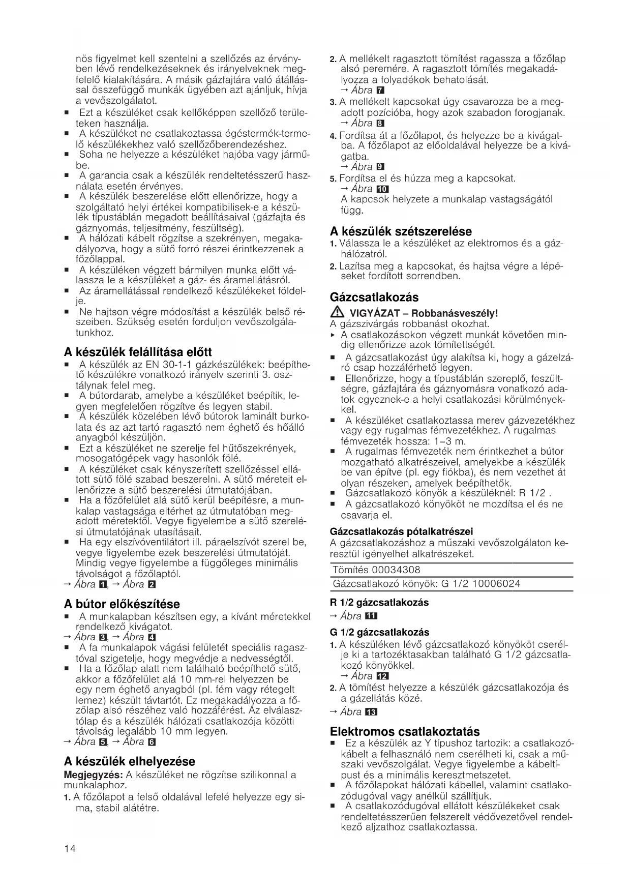 A csatlakozásokon végzett munkát követően min- dig ellenőrizze azok tömítettségét. ¡ A gázcsatlakozást úgy alakítsa ki, hogy a gázelzá- ró csap hozzáférhető legyen. ¡ Ellenőrizze, hogy a típustáblán szereplő, feszült- ségre, gázfajtára és gáznyomásra vonatkozó ada- tok egyeznek-e a helyi csatlakozási körülmények- kel. ¡ A készüléket csatlakoztassa merev gázvezetékhez vagy egy rugalmas fémvezetékhez. A rugalmas fémvezeték hossza: 1–3 m. ¡ A rugalmas fémvezeték nem érintkezhet a bútor mozgatható alkatrészeivel, amelyekbe a készülék be van építve (pl. egy fiókba), és nem vezethet át olyan részeken, amelyek beépíthetők. ¡ Gázcsatlakozó könyök a készüléknél: R 1/2 . ¡ A gázcsatlakozó könyököt ne mozdítsa el és ne csavarja el. Gázcsatlakozás pótalkatrészei A gázcsatlakozáshoz a műszaki vevőszolgálaton ke- resztül igényelhet alkatrészeket. Tömítés 00034308 Gázcsatlakozó könyök: G 1/2 10006024 R 1/2 gázcsatlakozás