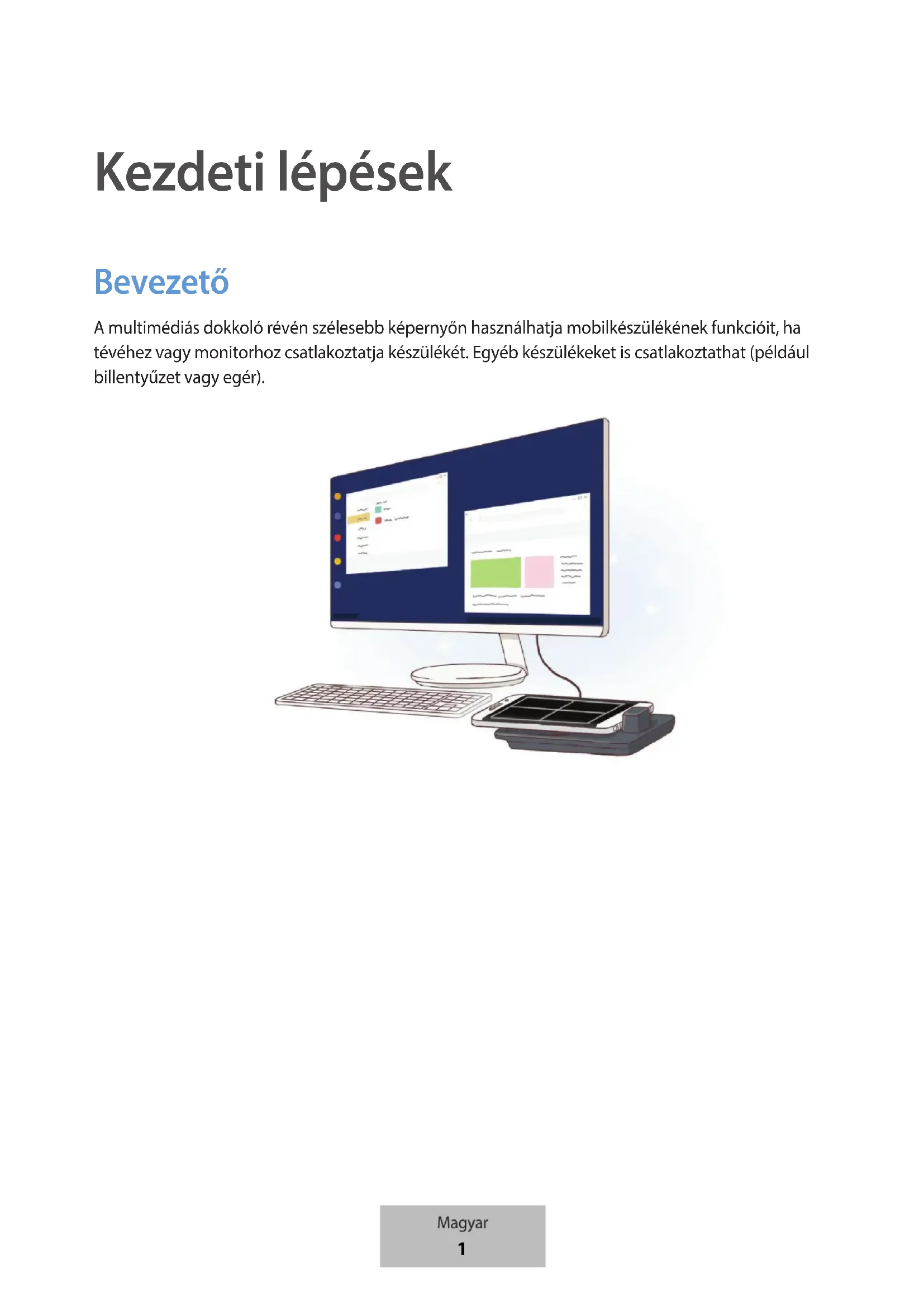 Kezdeti lépések Bevezető A multimédiás dokkoló révén szélesebb képernyőn használhatja mobilkészülékének funkcióit, ha tévéhez vagy monitorhoz csatlakoztatja készülékét. Egyéb készülékeket is csatlakoztathat (például billentyűzet vagy egér). Magyar 1Kezdeti lépések