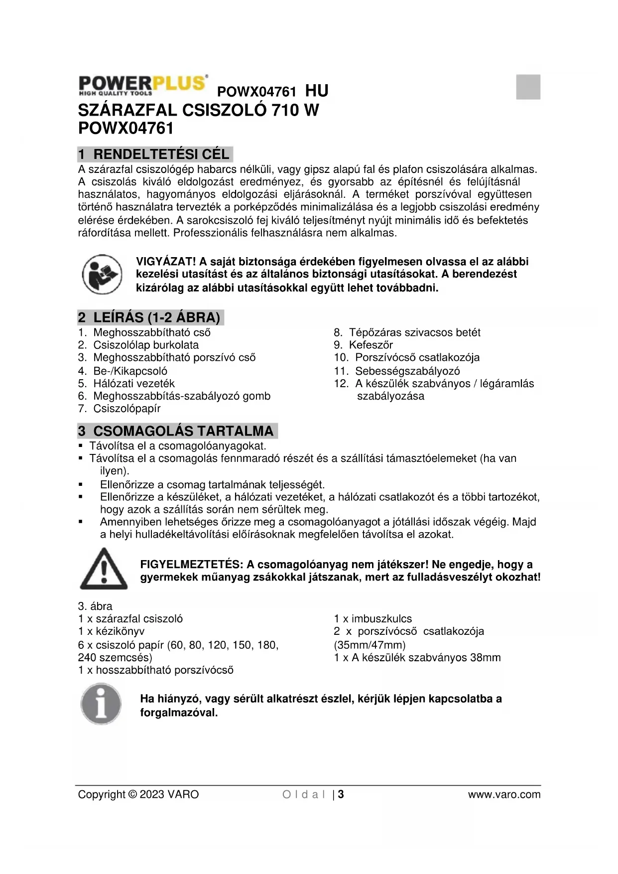 Ha a gép elhasználódott, ne dobja a háztartási szemétbe, hanem gondoskodjon környezetbarát elhelyezéséről! Az elhasználódott elektromos termékeket ne dobja a háztartási hulladékok közé. Kérjük, hogy gondoskodjon azok újrahasznosításáról, amennyiben erre lehetősége van. Az újrahasznosítási lehetőségekről érdeklődjön a helyi köztisztasági szerveknél!POWX04761 HU Copyright © 2023 VARO O l d a l | 11 www.varo.com