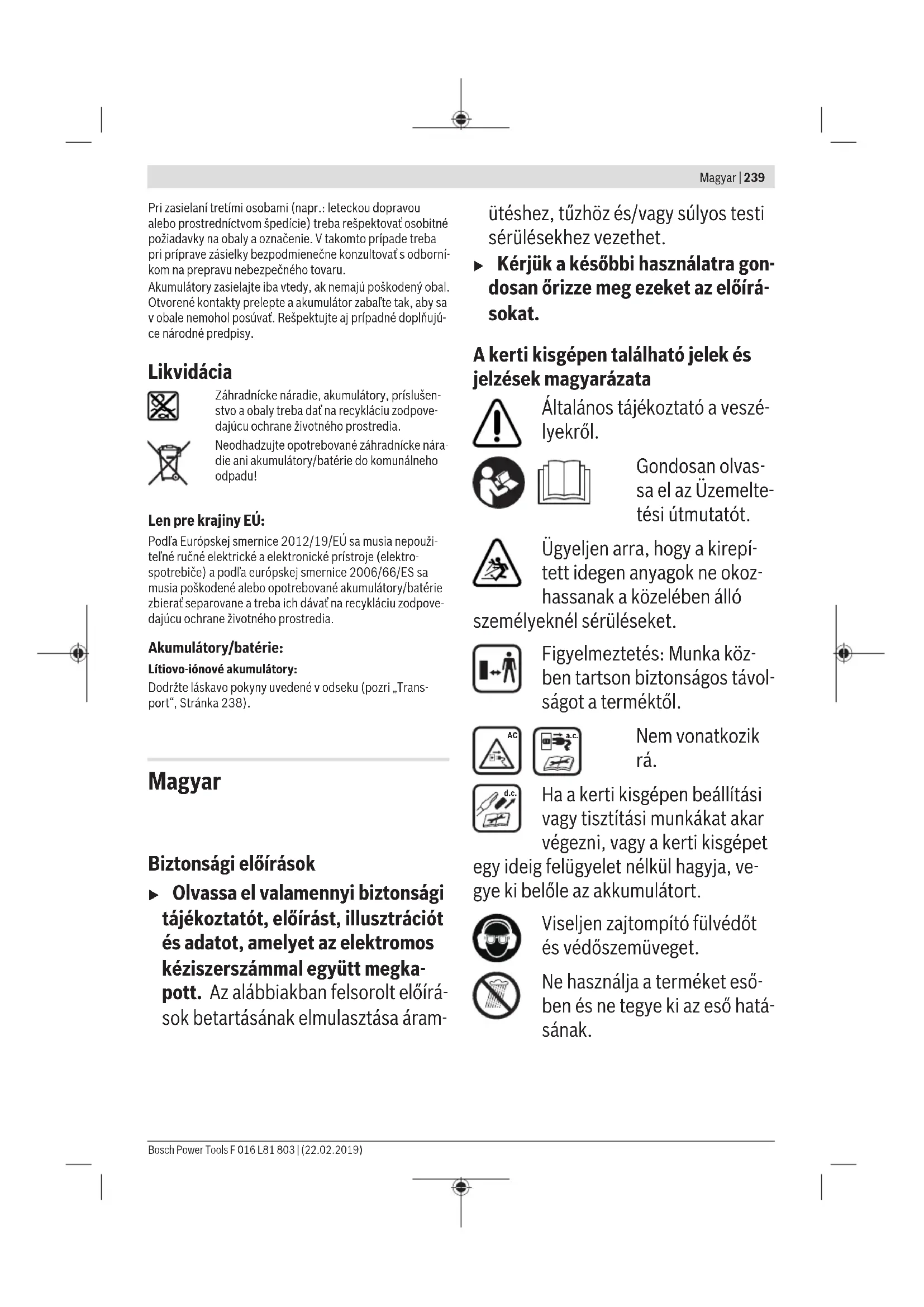 a.c. Nem vonatkozik rá. d.c. Ha a kerti kisgépen beállítási vagy tisztítási munkákat akar végezni, vagy a kerti kisgépet egy ideig felügyelet nélkül hagyja, ve- gye ki belőle az akkumulátort. Viseljen zajtompító fülvédőt és védőszemüveget. Ne használja a terméket eső- ben és ne tegye ki az eső hatá- sának. Bosch Power Tools F 016 L81 803 | (22.02.2019)240 | Magyar Ügyeljen arra, hogy a kirepített idegen anyagok ne okozhassanak a közelében álló személyeknél sérüléseket. Figyelmeztetés: Munka közben tartson biztonságos távolságot a kerti kisgép- től. Gondosan ellenőrizze azt a te- rületet, ahol a kerti kisgépet használni akarja, nincsenek-e ott háziállatok vagy más állatok. A gép működése során a háziállatok vagy más állatok sérüléseket szenvedhet- nek. Gondosan vizsgálja meg a gép használati területét és távolítson el minden követ, botot, drótot, csontot és minden más idegen tárgyat. A gép használata közben ügyeljen arra, hogy ne lehessenek nem látható háziállatok, más állatok vagy fatönkök a sűrű gyep alatt. Általános biztonsági előírások az elektromos kéziszerszámok számára u Olvassa el valamennyi biztonsági tájékoztatót, előírást, illusztrációt és adatot, amelyet az elektromos kéziszerszámmal együtt megka- pott. Az alábbiakban felsorolt előírá- sok betartásának elmulasztása áram- ütéshez, tűzhöz és/vagy súlyos testi sérülésekhez vezethet. u Kérjük a későbbi használatra gon- dosan őrizze meg ezeket az előírá- sokat. u Az alább alkalmazott "elektromos ké- ziszerszám" fogalom a hálózati elekt- romos kéziszerszámokat (hálózati csatlakozó kábellel) és az akkumulá- toros elektromos kéziszerszámokat (hálózati csatlakozó kábel nélkül) foglalja magában. Munkahelyi biztonság u Tartsa tisztán és jól megvilágítva a munkaterületet. A zsúfolt vagy sö- tét területeken gyakrabban követ- keznek be balesetek. u Ne dolgozzon a berendezéssel olyan robbanásveszélyes környe- zetben, ahol éghető folyadékok, gázok vagy por vannak. Az elektro- mos kéziszerszámok szikrákat kelte- nek, amelyek a port vagy a gőzöket meggyújthatják. u Tartsa távol a gyerekeket és a né- zelődőket, ha az elektromos kézi- szerszámot használja. Haelvonják a figyelmét, elvesztheti az uralmát a berendezés felett. Elektromos biztonsági előírások u A készülék csatlakozó dugójának bele kell illeszkednie a dugaszoló- aljzatba. A csatlakozó dugót sem- milyen módon sem szabad megvál- toztatni. Védőföldeléssel ellátott F 016 L81 803 | (22.02.2019) Bosch Power ToolsMagyar | 241 készülékek esetében ne használ- jon csatlakozó adaptert. Aváltoz- tatás nélküli csatlakozó dugók és a megfelelő dugaszoló aljzatok csök- kentik az áramütés kockázatát. u Kerülje el a földelt felületekkel va- ló érintkezést, mint például csö- vek, fűtőtestek, kályhák és hűtő- gépek. Az áramütés veszélye meg- növekszik, ha a teste földelve van. u Tartsa távol az elektromos kézi- szerszámot az esőtől és a nedves- ségtől. Ha víz jut be egy elektromos kéziszerszámba, az megnöveli az áramütés veszélyét. u Ne használja a kábelt a rendelteté- sétől eltérő célokra. Sohase vigye vagy húzza az elektromos kézi- szerszámot a kábelnél fogva, vala- mint sose húzza ki a csatlakozót a kábelnél fogva a dugaszoló aljzat- ból. Tartsa távol a kábelt hőforrá- soktól, olajtól, éles sarkoktól és élektől, valamint mozgó gépalkat- részektől. A megrongálódott vagy csomókkal teli kábel megnöveli az áramütés veszélyét. u Ha egy elektromos kéziszerszám- mal a szabadban dolgozik, csak kültéri hosszabbítót használjon. A kültéri hosszabbító használata csök- kenti az áramütés veszélyét. u Ha nem lehet elkerülni az elektro- mos kéziszerszám nedves környe- zetben való használatát, alkalmaz- zon egy hibaáram-védőkapcsolót. A hibaáram-védőkapcsoló alkalmazá- sa csökkenti az áramütés kockázatát. Személyi biztonság u Munka közben mindig figyeljen, ügyeljen arra, amit csinál és meg- fontoltan dolgozzon az elektromos kéziszerszámmal. Ne használja a berendezést ha fáradt vagy kábító- szer, alkohol vagy gyógyszer hatá- sa alatt áll. Egy pillanatnyi figyelmet- lenség a szerszám használata közben komoly sérülésekhez vezethet. u Viseljen védőfelszerelést. Viseljen mindig védőszemüveget. Avédő- felszerelések, mint a porvédő álarc, csúszásbiztos védőcipő, védősapka és fülvédő megfelelő használata csökkenti a személyi sérülések koc- kázatát. u Kerülje el a készülék akaratlan üzembe helyezését. Győződjön meg arról, hogy az elektromos ké- ziszerszám ki van kapcsolva, mi- előtt beköti az áramforrást és/ vagy az akkumulátort, valamint mielőtt felemelné és vinni kezdené az elektromos kéziszerszámot. Haaz elektromos kéziszerszám fel- emelése közben az ujját a kapcsolón tartja, vagy ha akészüléket bekap- csolt állapotban csatlakoztatja az áramforráshoz, az baleset vezethet. u Az elektromos kéziszerszám be- kapcsolása előtt okvetlenül távo- lítsa el abeállítószerszámokat vagy csavarkulcsokat. Az elektro- Bosch Power Tools F 016 L81 803 | (22.02.2019)242 | Magyar mos kéziszerszám forgó részeiben felejtett beállítószerszám vagy csa- varkulcs sérüléseket okozhat. u Ne becsülje túl önmagát. Ügyeljen arra, hogy mindig biztosan álljon és az egyensúlyát megtartsa. Így az elektromos kéziszerszám felett vá- ratlan helyzetekben is jobban tud uralkodni. u Viseljen megfelelő ruházatot. Ne viseljen bő ruhát vagy ékszereket. Tartsa távol a haját és a ruháját a mozgó részektől. A bő ruhát, az ék- szereket és a hosszú hajat a szer- szám mozgó részei magukkal ránt- hatják. u Ha az elektromos kéziszerszámra fel lehet szerelni a por