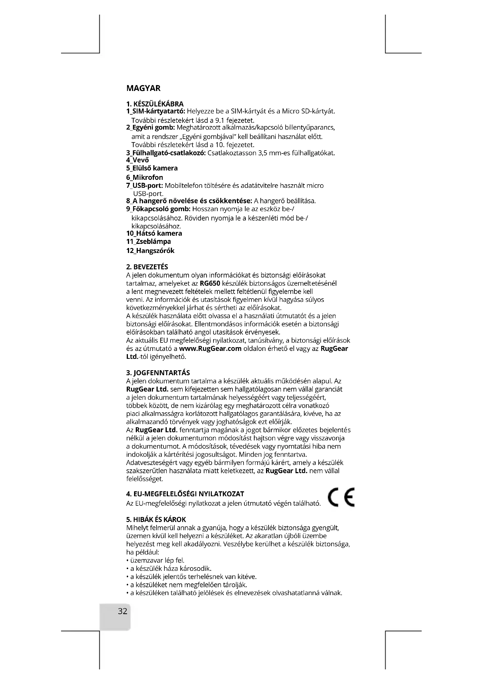 A halózat vagy az adatcsere funkció hasznalata során letoltött karos tartalmak által okozott minded kártér kizárólag a felhasználo felelos. Az RugGear Ltd. nem teheto felelossé semmilyen, a fentiekból eredő kovetelésert.