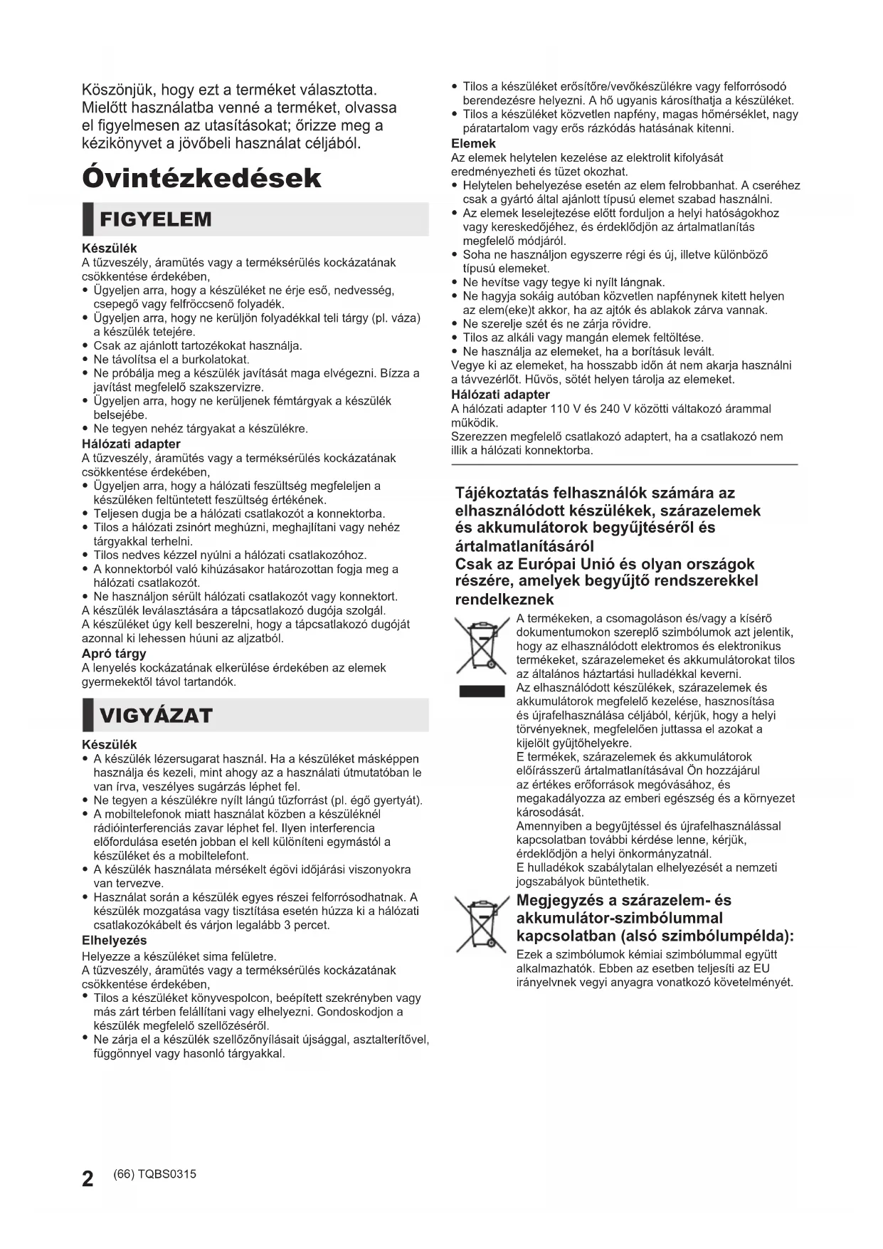 Ne használja az elemeket, ha a borításuk levált.Vegye ki az elemeket, ha hosszabb időn át nem akarja használni a távvezérlőt. Hűvös, sötét helyen tárolja az elemeket.Hálózati adapterA hálózati adapter 110 V és 240 V közötti váltakozó árammal működik.Szerezzen megfelelő csatlakozó adaptert, ha a csatlakozó nem illik a hálózati konnektorba. Tájékoztatás felhasználók számára az elhasználódott készülékek, szárazelemek és akkumulátorok begyűjtéséről és ártalmatlanításáról Csak az Európai Unió és olyan országok részére, amelyek begyűjtő rendszerekkel rendelkeznek A termékeken, a csomagoláson és/vagy a kísérődokumentumokon szereplő szimbólumok azt jelentik, hogy az elhasználódott elektromos és elektronikus termékeket, szárazelemeket és akkumulátorokat tilos az általános háztartási hulladékkal keverni.Az elhasználódott készülékek, szárazelemek és akkumulátorok megfelelő kezelése, hasznosítása és újrafelhasználása céljából, kérjük, hogy a helyi törvényeknek, megfelelően juttassa el azokat a kijelölt gyűjtőhelyekre.E termékek, szárazelemek és akkumulátorok előírásszerű ártalmatlanításával Ön hozzájárul az értékes erőforrások megóvásához, és megakadályozza az emberi egészség és a környezet károsodását.Amennyiben a begyűjtéssel és újrafelhasználással kapcsolatban további kérdése lenne, kérjük, érdeklődjön a helyi önkormányzatnál.E hulladékok szabálytalan elhelyezését a nemzeti jogszabályok büntethetik. Megjegyzés a szárazelem- és akkumulátor-szimbólummal kapcsolatban (alsó szimbólumpélda): Ezek a szimbólumok kémiai szimbólummal együtt alkalmazhatók. Ebben az esetben teljesíti az EU irányelvnek vegyi anyagra vonatkozó követelményét. QG_UB450EG.indb 66 2018/12/24 16:12:37(67)TQBS0315Magyar