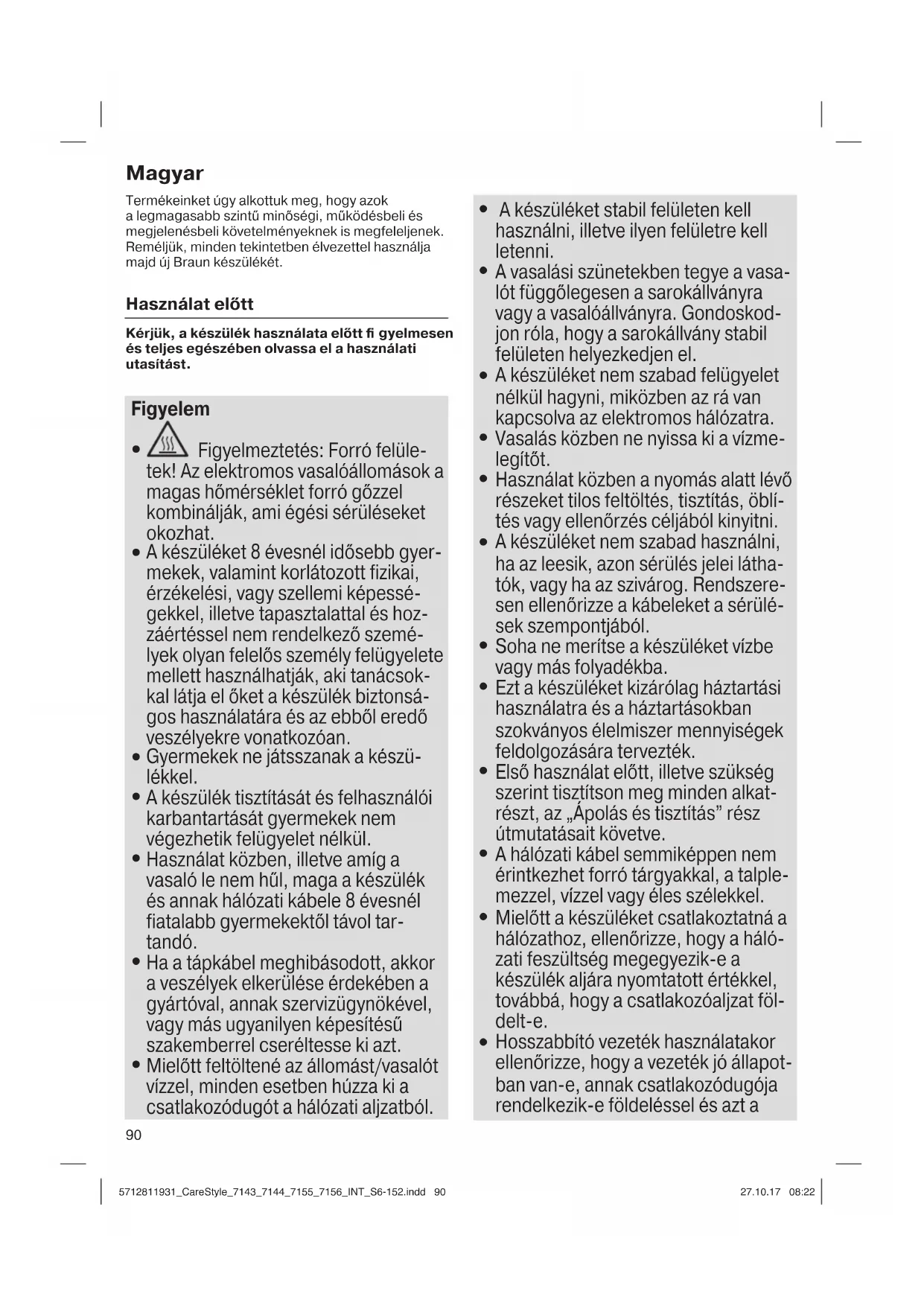 Hosszabbító vezeték használatakor ellenőrizze, hogy a vezeték jó állapot- ban van-e, annak csatlakozódugója rendelkezik-e földeléssel és azt a 5712811931_CareStyle_7143_7144_7155_7156_INT_S6-152.indd 905712811931_CareStyle_7143_7144_7155_7156_INT_S6-152.indd 90 27.10.17 08:2227.10.17 08:2291 készülék névleges áramerősségére (16 A) méretezték-e.