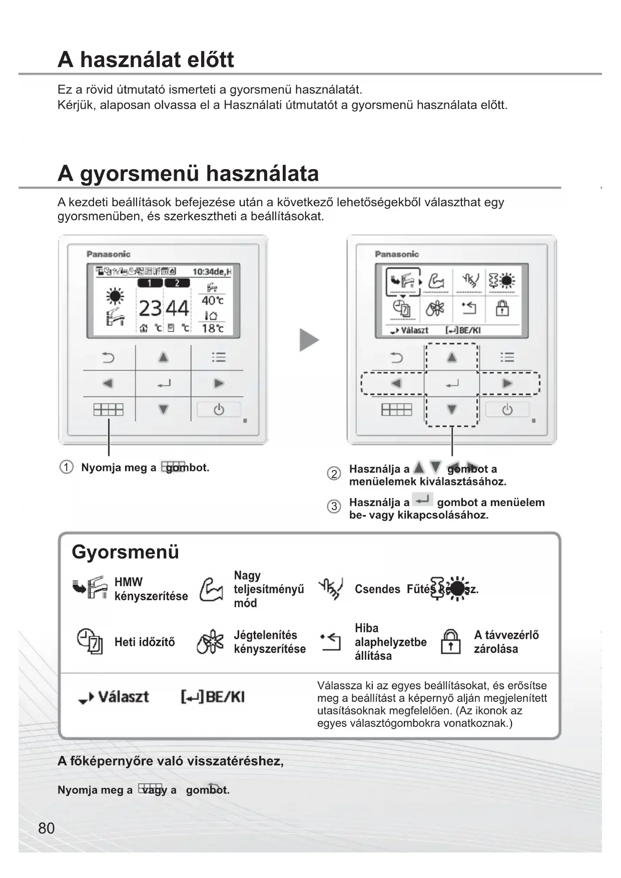 Ez a rövid útmutató ismerteti a gyorsmenü használatát. Kérjük, alaposan olvassa el a Használati útmutatót a gyorsmenü használata előtt. A használat előtt A gyorsmenü használata A kezdeti beállítások befejezése után a következő lehetőségekből választhat egy gyorsmenüben, és szerkesztheti a beállításokat.