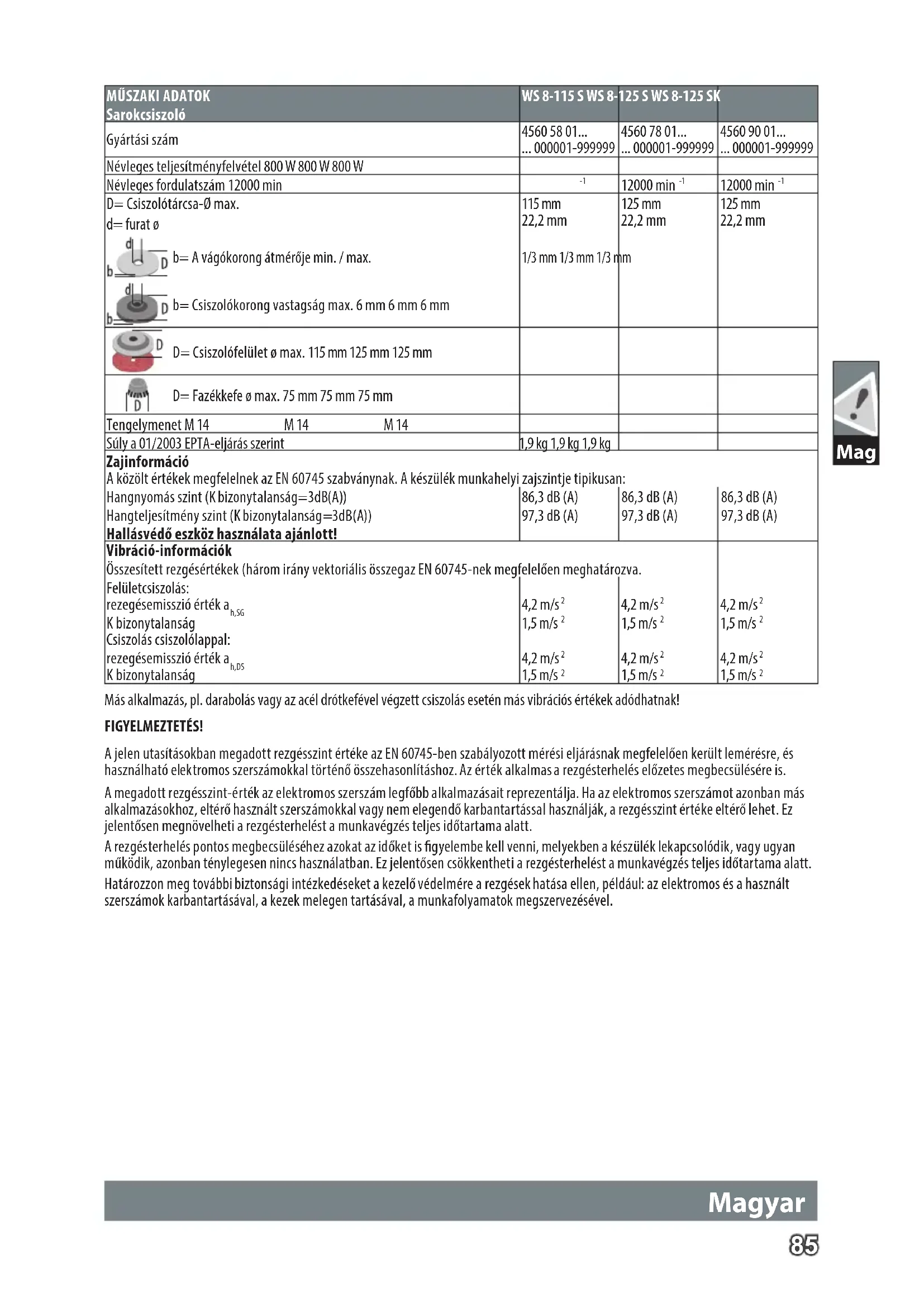 D= Csiszolótárcsa-Ø max. d= furat ø 115 mm 22,2 mm 125 mm 22,2 mm 125 mm 22,2 mm b= A vágókorong átmérője min. / max. 1/3 mm 1/3 mm 1/3 mm b= Csiszolókorong vastagság max. 6 mm 6 mm 6 mm D= Csiszolófelület ø max. 115 mm 125 mm 125 mm D= Fazékkefe ø max. 75 mm 75 mm 75 mm Tengelymenet M 14 M 14 M 14 Súly a 01/2003 EPTA-eljárás szerint 1,9 kg 1,9 kg 1,9 kg Zajinformáció A közölt értékek megfelelnek az EN 60745 szabványnak. A készülék munkahelyi zajszintje tipikusan: Hangnyomás szint (K bizonytalanság=3dB(A)) 86,3 dB (A) 86,3 dB (A) 86,3 dB (A) Hangteljesítmény szint (K bizonytalanság=3dB(A)) 97,3 dB (A) 97,3 dB (A) 97,3 dB (A) Hallásvédő eszköz használata ajánlott! Vibráció-információk Összesített rezgésértékek (három irány vektoriális összegaz EN 60745-nek megfelelően meghatározva. Felületcsiszolás: rezegésemisszió érték a h,SG K bizonytalanság 4,2 m/s