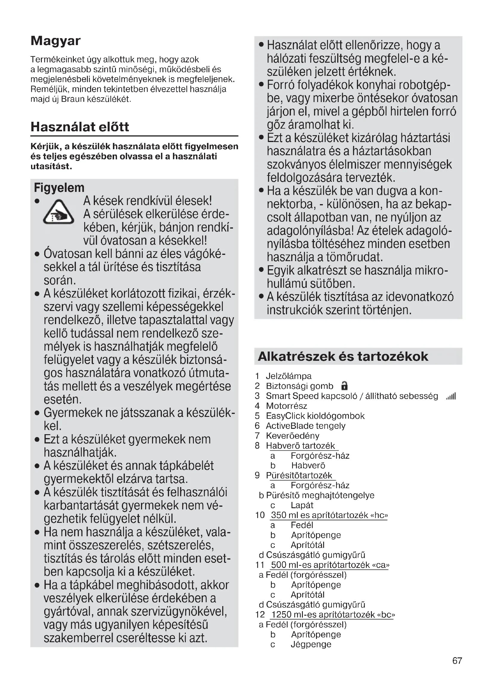 - Pri spracovaní potravín s vysokým obsahom farbív (napr. mrkva) môže dôjsť k zafarbeniu príslušenstva. Pred čistením utrite tieto diely rastlinným olejom. Dizajnové špecifikácie a tieto používateľské pokyny podliehajú zmenám bez predchádzajúceho upozornenia. Produkt na konci svojej životnosti nelikvidujte v komunálnom odpade. Zlikvidovať ho môžete cez servisné stredisko spoločnosti Braun alebo na príslušných zberných miestach vo vašej krajine. Materiály a predmety určené pre styk s potravinami sú v súlade s požiadav- kami európskeho nariadenia 1935/2004. 5722112414_MQ9045X_INT_S6-116.indd 66 17.10.16 11:2167 Magyar Termékeinket úgy alkottuk meg, hogy azok a legmagasabb szintű minőségi, működésbeli és megjelenésbeli követelményeknek is megfeleljenek. Reméljük, minden tekintetben élvezettel használja majd új Braun készülékét. Használat előtt Kérjük, a készülék használata előtt figyelmesen és teljes egészében olvassa el a használati utasítást. Figyelem