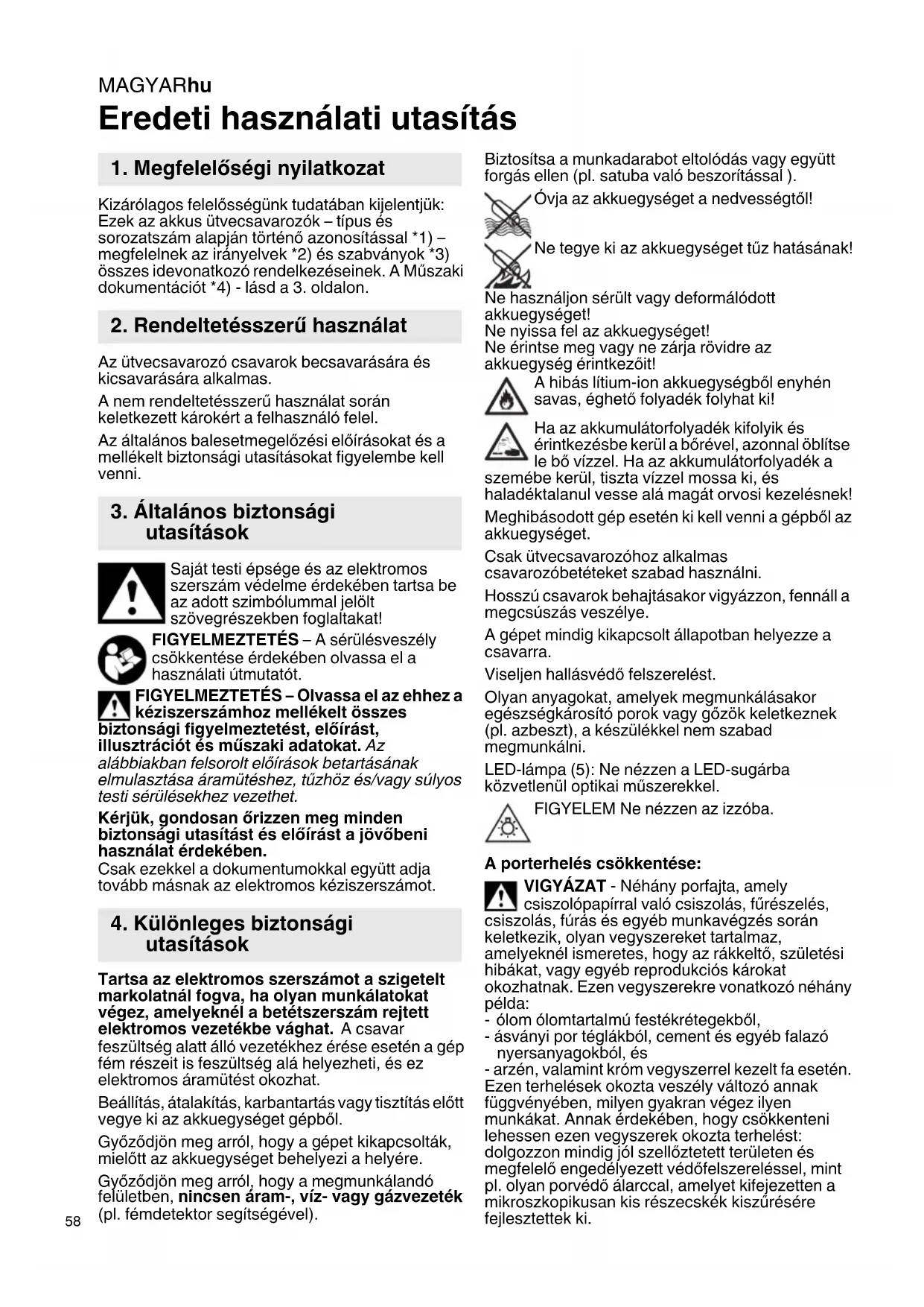 Eredeti használati utasítás Kizárólagos felelősségünk tudatában kijelentjük: Ezek az akkus ütvecsavarozók – típus és sorozatszám alapján történő azonosítással *1) – megfelelnek az irányelvek *2) és szabványok *3) összes idevonatkozó rendelkezéseinek. A Műszaki dokumentációt *4) - lásd a 3. oldalon. Az ütvecsavarozó csavarok becsavarására és kicsavarására alkalmas. A nem rendeltetésszerű használat során keletkezett károkért a felhasználó felel. Az általános balesetmegelőzési előírásokat és a mellékelt biztonsági utasításokat figyelembe kell venni. Saját testi épsége és az elektromos szerszám védelme érdekében tartsa be az adott szimbólummal jelölt szövegrészekben foglaltakat! FIGYELMEZTETÉS – A sérülésveszély csökkentése érdekében olvassa el a használati útmutatót. FIGYELMEZTETÉS – Olvassa el az ehhez a kéziszerszámhoz mellékelt összes biztonsági figyelmeztetést, előírást, illusztrációt és műszaki adatokat. Az alábbiakban felsorolt előírások betartásának elmulasztása áramütéshez, tűzhöz és/vagy súlyos testi sérülésekhez vezethet. Kérjük, gondosan őrizzen meg minden biztonsági utasítást és előírást a jövőbeni használat érdekében. Csak ezekkel a dokumentumokkal együtt adja tovább másnak az elektromos kéziszerszámot. Tartsa az elektromos szerszámot a szigetelt markolatnál fogva, ha olyan munkálatokat végez, amelyeknél a betétszerszám rejtett elektromos vezetékbe vághat. A csavar feszültség alatt álló vezetékhez érése esetén a gép fém részeit is feszültség alá helyezheti, és ez elektromos áramütést okozhat. Beállítás, átalakítás, karbantartás vagy tisztítás előtt vegye ki az akkuegységet gépből. Győződjön meg arról, hogy a gépet kikapcsolták, mielőtt az akkuegységet behelyezi a helyére. Győződjön meg arról, hogy a megmunkálandó felületben, nincsen áram-, víz- vagy gázvezeték (pl. fémdetektor segítségével). Biztosítsa a munkadarabot eltolódás vagy együtt forgás ellen (pl. satuba való beszorítással ). Óvja az akkuegységet a nedvességtől! Ne tegye ki az akkuegységet tűz hatásának! Ne használjon sérült vagy deformálódott akkuegységet! Ne nyissa fel az akkuegységet! Ne érintse meg vagy ne zárja rövidre az akkuegység érintkezőit! A hibás lítium-ion akkuegységből enyhén savas, éghető folyadék folyhat ki! Ha az akkumulátorfolyadék kifolyik és érintkezésbe kerül a bőrével, azonnal öblítse le bő vízzel. Ha az akkumulátorfolyadék a szemébe kerül, tiszta vízzel mossa ki, és haladéktalanul vesse alá magát orvosi kezelésnek! Meghibásodott gép esetén ki kell venni a gépből az akkuegységet. Csak ütvecsavarozóhoz alkalmas csavarozóbetéteket szabad használni. Hosszú csavarok behajtásakor vigyázzon, fennáll a megcsúszás veszélye. A gépet mindig kikapcsolt állapotban helyezze a csavarra. Viseljen hallásvédő felszerelést. Olyan anyagokat, amelyek megmunkálásakor egészségkárosító porok vagy gőzök keletkeznek (pl. azbeszt), a készülékkel nem szabad megmunkálni. LED-lámpa (5): Ne nézzen a LED-sugárba közvetlenül optikai műszerekkel. FIGYELEM Ne nézzen az izzóba. A porterhelés csökkentése: VIGYÁZAT - Néhány porfajta, amely csiszolópapírral való csiszolás, fűrészelés, csiszolás, fúrás és egyéb munkavégzés során keletkezik, olyan vegyszereket tartalmaz, amelyeknél ismeretes, hogy az rákkeltő, születési hibákat, vagy egyéb reprodukciós károkat okozhatnak. Ezen vegyszerekre vonatkozó néhány példa: - ólom ólomtartalmú festékrétegekből, - ásványi por téglákból, cement és egyéb falazó nyersanyagokból, és - arzén, valamint króm vegyszerrel kezelt fa esetén. Ezen terhelések okozta veszély változó annak függvényében, milyen gyakran végez ilyen munkákat. Annak érdekében, hogy csökkenteni lehessen ezen vegyszerek okozta terhelést: dolgozzon mindig jól szellőztetett területen és megfelelő engedélyezett védőfelszereléssel, mint pl. olyan porvédő álarccal, amelyet kifejezetten a mikroszkopikusan kis részecskék kiszűrésére fejlesztettek ki.