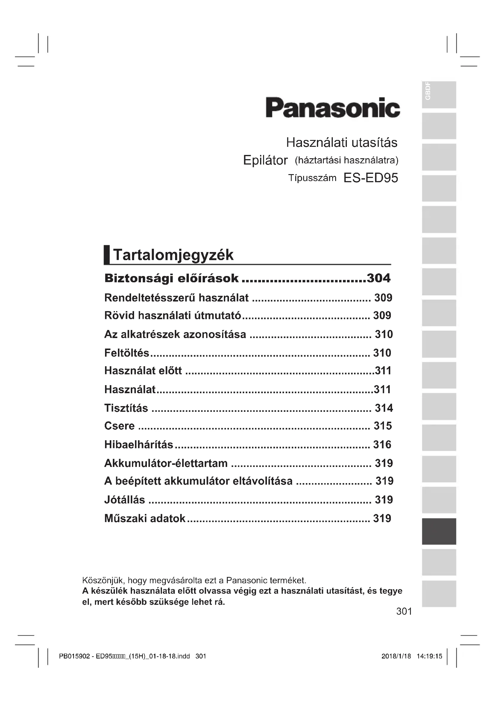 - Ügyeljen arra, hogy ne zárja rövidre a kiszerelt akkumulátor pozitív és negatív érintkezőjét,továbbászigetelőszalag használatával szigetelje le az érintkezőket. Környezetvédelem és újrahasznosítás Az epilátor lítium‑ion akkumulátort tartalmaz. Az akkumulátort feltétlenül valamelyik hivatalosan kijelölt helyen ártalmatlanítsa, havanilyenazországban! Jótállás Kérjük, látogassa meg a Panasonic weboldalt(http://www.panasonic.com), vagy lépjen kapcsolatba vevőszolgálatunkkal(elérhetőségeinket a páneurópai jótállási jegyen találja) amennyiben az epilátor vagy a tápkábel megsérült. Műszaki adatok Áramellátás Lásd a hálózati adapterenlevő adattáblát. (Automatikus feszültségátalakítás) Töltésiidő Kb. 1 óra Levegőben terjedő akusztikai zaj Epilálófej kar/láb szőrtelenítéséhez: 69 (dB (A) 1 pW teljesítménynél) Epilálófej hónalj/ bikinivonal szőrtelenítéséhez: 67 (dB (A) 1 pW teljesítménynél) Borotvafej: 61 (dB (A) 1 pW teljesítménynél) Lábápolófej: 66 (dB (A) 1 pW teljesítménynél) Kefefej szónikus dörzskefével: 65 (dB (A) 1 pW teljesítménynél) Ezt a készüléket kizárólag háztartási használatra tervezték. PB015902 - ED95_(15H)_01-18-18.indd 319 2018/1/18 14:19:18320 Tájékoztatás felhasználók számára az elhasználódott készülékek, szárazelemek és akkumulátorok begyűjtéséről és ártalmatlanításáról. Csak az Európai Unió és olyan országok részére, amelyek begyűjtő rendszerekkel rendelkeznek Atermékeken,acsomagolásonés/vagyakísérődokumentumokon szereplőszimbólumokaztjelentik,hogyazelhasználódott elektromos és elektronikus termékeket, szárazelemeket és akkumulátorokat tilos az általános háztartási hulladékkal keverni. Az elhasználódott készülékek, szárazelemek és akkumulátorok megfelelőkezelése,hasznosításaésújrafelhasználásacéljából, kérjük,hogyahelyitörvényeknek,megfelelőenjuttassaelazokata kijelöltgyűjtőhelyekre. Etermékek,szárazelemekésakkumulátorokelőírásszerű ártalmatlanításávalÖnhozzájárulazértékeserőforrások megóvásához, és megakadályozza az emberi egészség és a környezet károsodását. Amennyibenabegyűjtésselésújrafelhasználássalkapcsolatban továbbikérdéselenne,kérjük,érdeklődjönahelyiönkormányzatnál. E hulladékok szabálytalan elhelyezését a nemzeti jogszabályok büntethetik. Megjegyzés a szárazelem- és akkumulátor-szimbólummal kapcsolatban (alsó szimbólumpélda) Ezek a szimbólumok kémiai szimbólummal együtt alkalmazhatók. Ebben az esetben teljesíti az EU irányelvnek vegyi anyagra vonatkozó követelményét. Műszakiadatok: Minőségtanúsítás Motorfeszültség:3,6VDCegyenfeszültség Töltésiidő:1óra Ezt a készüléket kizárólag háztartási használatra tervezték. Tápellátás:beépítettakkumulátor Tápfeszültség:3,6Vegyenfeszültség Méretek (szélesség x magasság ×mélység):5,5cm× 12,6 cm × 4,1 cm Tömeg:170g Hálózatitápegységésakkumulátortöltőadatai: Típus:RE7-87 Hálózatifeszültség:100-240VAC,50-60Hz(Automatikusfeszültségátalakítás) Áramfelvétel:180mA Kimenőfeszültég:4,8Vegyenfeszültség Terhelhetőség:1,25A Érintésvédelmiosztály:II. Méretek(szélességxmagasságxmélység):4,3cm× 10,1 cm × 2,3 cm Tömeg:130g Megjegyzés:Aműszakiadatokváltoztatásánakjogátfenntartjuk. Atömegésméretadatokmegközelítőértékek. PB015902 - ED95_(15H)_01-18-18.indd 320 2018/1/18 14:19:18321 GBDFINLEDKPNSFINPLCZSKHROTR Vă mulţumim că aţi achiziţionat acest produs Panasonic.Înainte de a utiliza acest dispozitiv, vă rugăm să citiţi toate aceste instrucţiuni şi să le păstraţi pentru referinţe ulterioare. Instrucţiuni de utilizare Epilator (pentru uz casnic) Nr. Model ES‑ED95 Cuprins Măsuri de siguranţă ................................324 Domeniul de utilizare .................................................. 329 Paşi rapizi pentru utilizare .......................................... 330 Identicarea părţilor componente.............................. 330 Încărcare....................................................................... 330 Înainte de utilizare ....................................................... 331 Mod de utilizare ........................................................... 332 Curăţare ........................................................................ 335 Înlocuirea ..................................................................... 336 Depanare ...................................................................... 337 Durata de viaţă a acumulatorului ............................... 339 Îndepărtarea acumulatorului încorporat ................... 339 Garanţie ........................................................................ 339 Specicaţii.................................................................... 339 PB015902 - ED95_(16RO)_01-18-18.indd 321 2018/1/18 14:21:17322 Avertisment