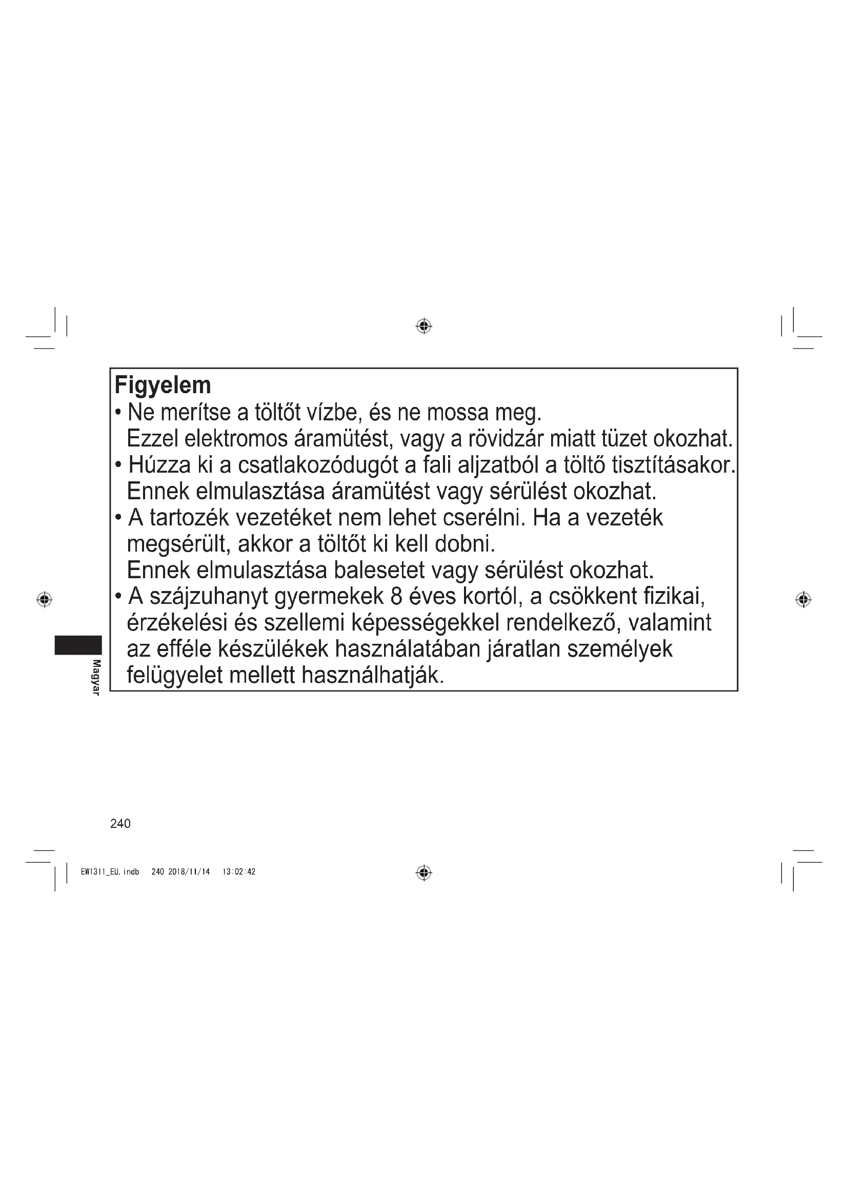 Ha túl sok csatlakozódugó csatlakoztatásával túllépi a fali aljzat terhelhetőségét, akkor a túlmelegedés miatt tüzet okozhat. EW1311_EU.indb 242 2018/11/14 13:02:42243 Magyar FIGYELEM Mindenesetbengyőződjönmegróla,hogyakészülék atöltőnfeltüntetettnévlegesfeszültségértékének megfelelőelektromostápforrásracsatlakozik. Teljesendugjabeacsatlakozódugót.