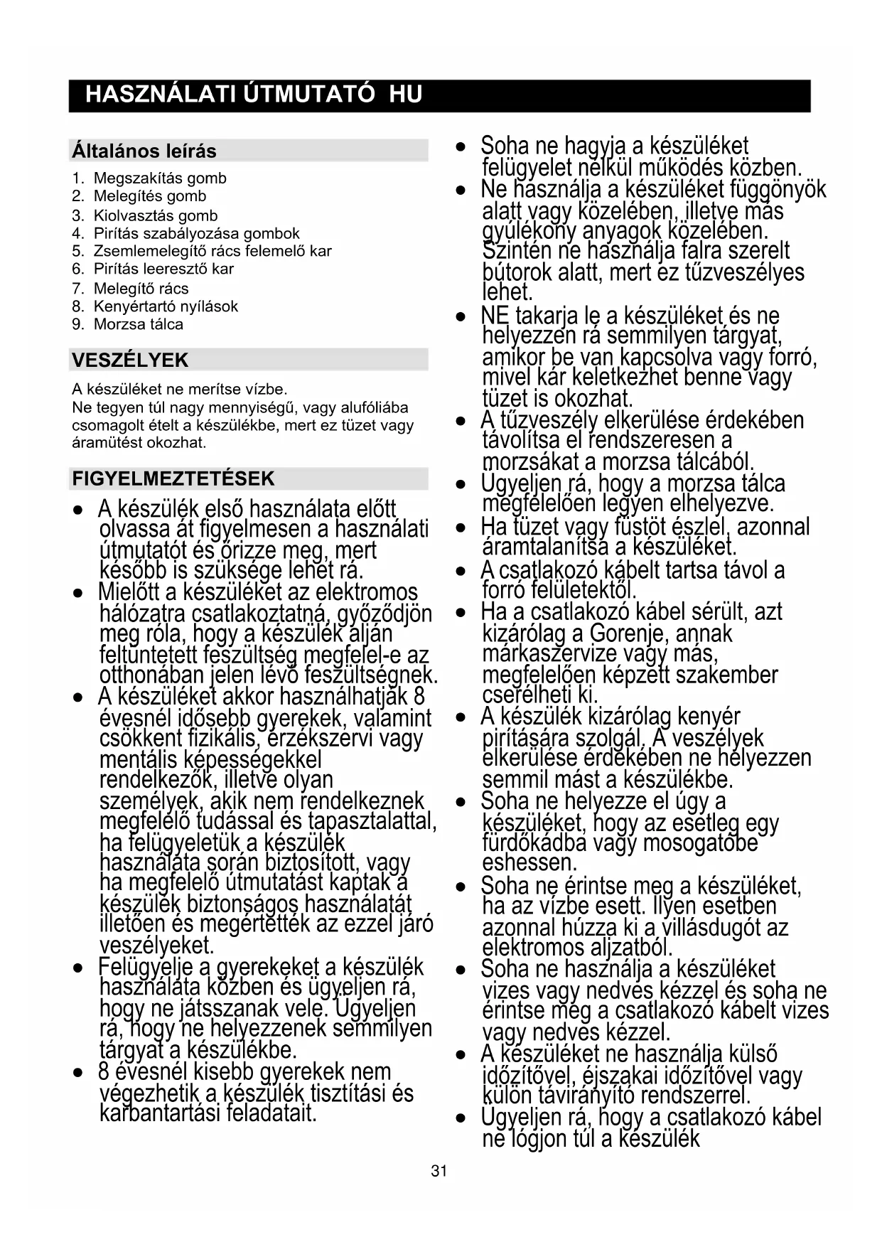 - A készülék kizárólag kenyér pirítására szolgál, A veszélyek elkerülése érdékében ne helyezzen semmil mást a készülékbe.