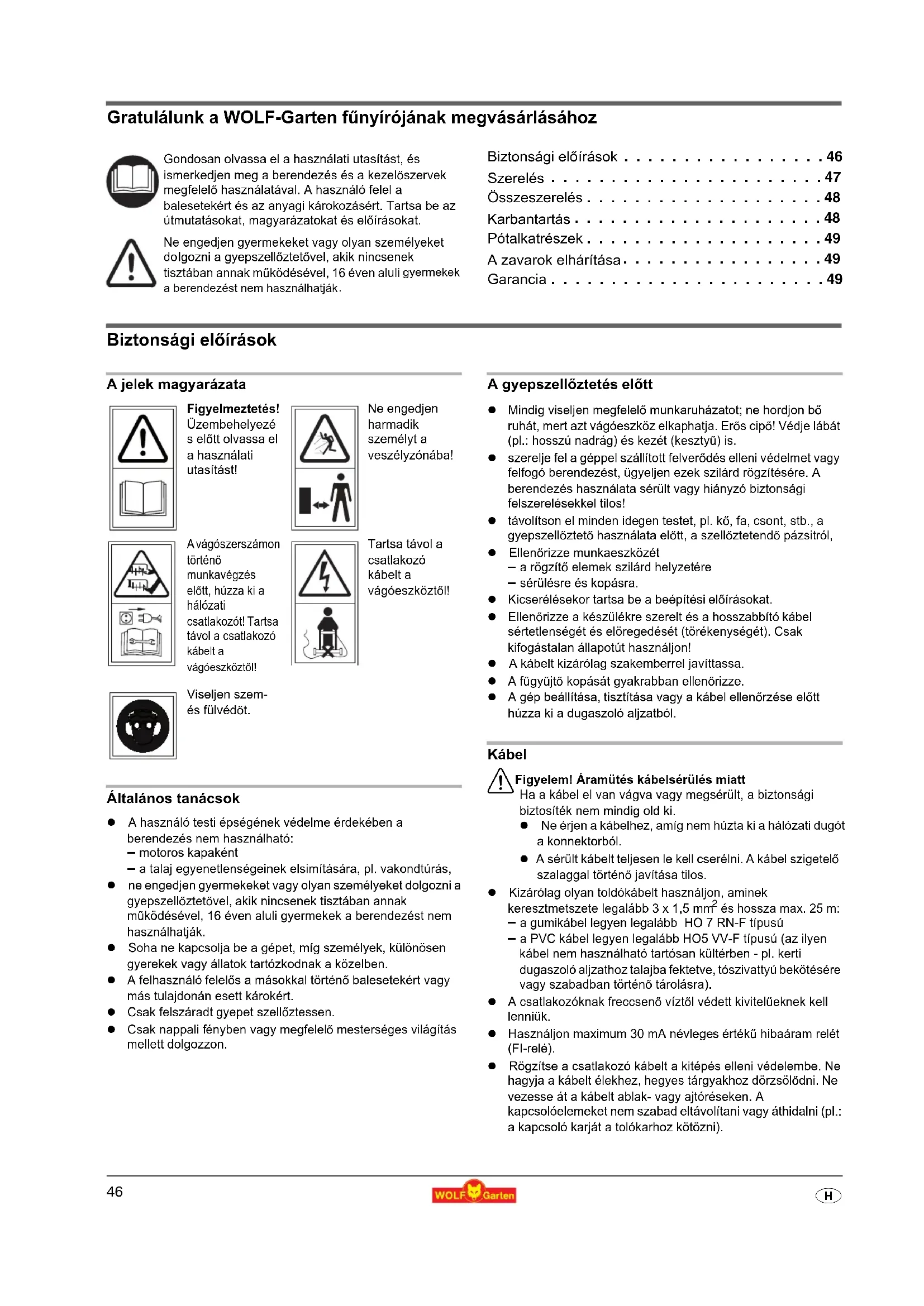 H Gratulálunk a WOLF-Garten fűnyírójának megvásárlásához Biztonsági előírások . . . . . . . . . . . . . . . . . 46 Szerelés