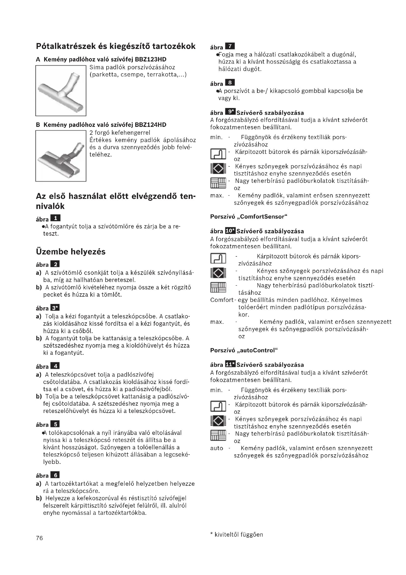 - kiviteltől függően76 Pótalkatrészek és kiegészítő tartozékok A Kemény padlóhoz való szívófej BBZ123HD Sima padlók porszívózásához (parketta, csempe, terrakotta,...) B Kemény padlóhoz való szívófej BBZ124HD 2 forgó kefehengerrel Értékes kemény padlók ápolásához és a durva szennyeződés jobb felvé- teléhez. Az első használat előtt elvégzendő ten- nivalók ábra