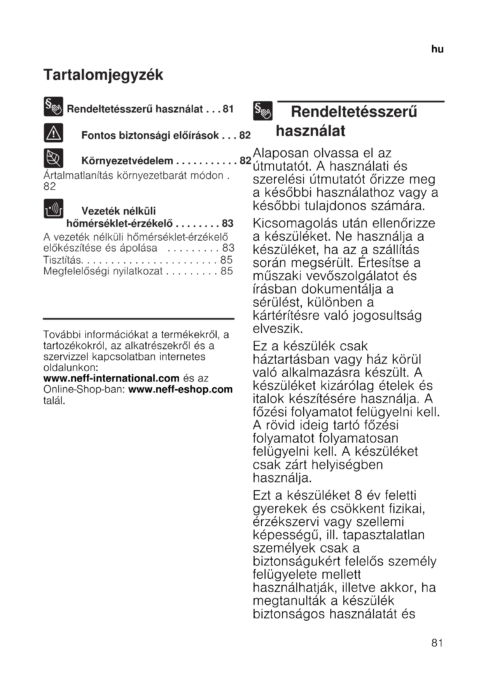 - Megfelelőségi nyilatkozat Produktinfo További információkat a termékekről, a tartozékokról, az alkatrészekről és a szervizzel kapcsolatban internetes oldalunkon: www.neff-international.com és az Online-Shop-ban: www.neff-eshop.com talál. 8 Rendeltetésszerű használat Rendeltetésszerű használat Alaposan olvassa el az útmutatót. A használati és szerelési útmutatót őrizze meg a későbbi használathoz vagy a későbbi tulajdonos számára. Kicsomagolás után ellenőrizze a készüléket. Ne használja a készüléket, ha az a szállítás során megsérült. Értesítse a műszaki vevőszolgálatot és írásban dokumentálja a sérülést, különben a kártérítésre való jogosultság elveszik. Ez a készülék csak háztartásban vagy ház körül való alkalmazásra készült. A készüléket kizárólag ételek és italok készítésére használja. A főzési folyamatot felügyelni kell. A rövid ideig tartó főzési folyamatot folyamatosan felügyelni kell. A készüléket csak zárt helyiségben használja. Ezt a készüléket 8 év feletti gyerekek és csökkent fizikai, érzékszervi vagy szellemi képességű, ill. tapasztalatlan személyek csak a biztonságukért felelős személy felügyelete mellett használhatják, illetve akkor, ha megtanulták a készülék biztonságos használatát éshu p. 85