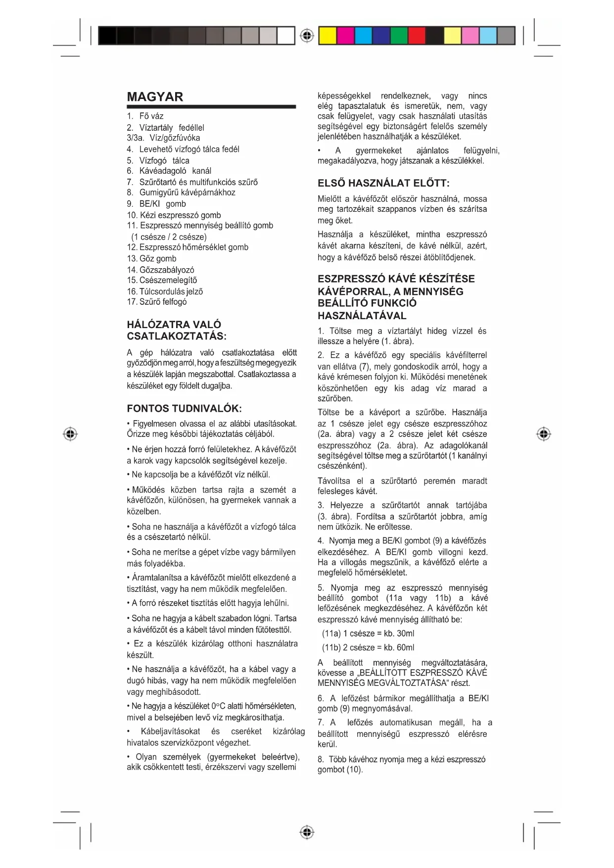 című részben. Nyomja meg a kézi eszpresszó gombot (10) a kávé lefőzésének megkezdéséhez. A kávé folyását a gomb (10) ismételt benyomásával állítsa meg. VIGYÁZAT: Ne próbálja a szűrőtartót kilazítani, amíg a (10) vagy a gomb (11) be van kapcsolva. Mivel a kávéfőző önfeltöltő rendszerrel van ellátva, nincs szükség különösebb művelet végrehajtására a víztartály kiürülése esetében, vagy egy hosszabb időszak után, amikor a kávéfőző nem volt használatban. AZ ESZPRESSZÓ