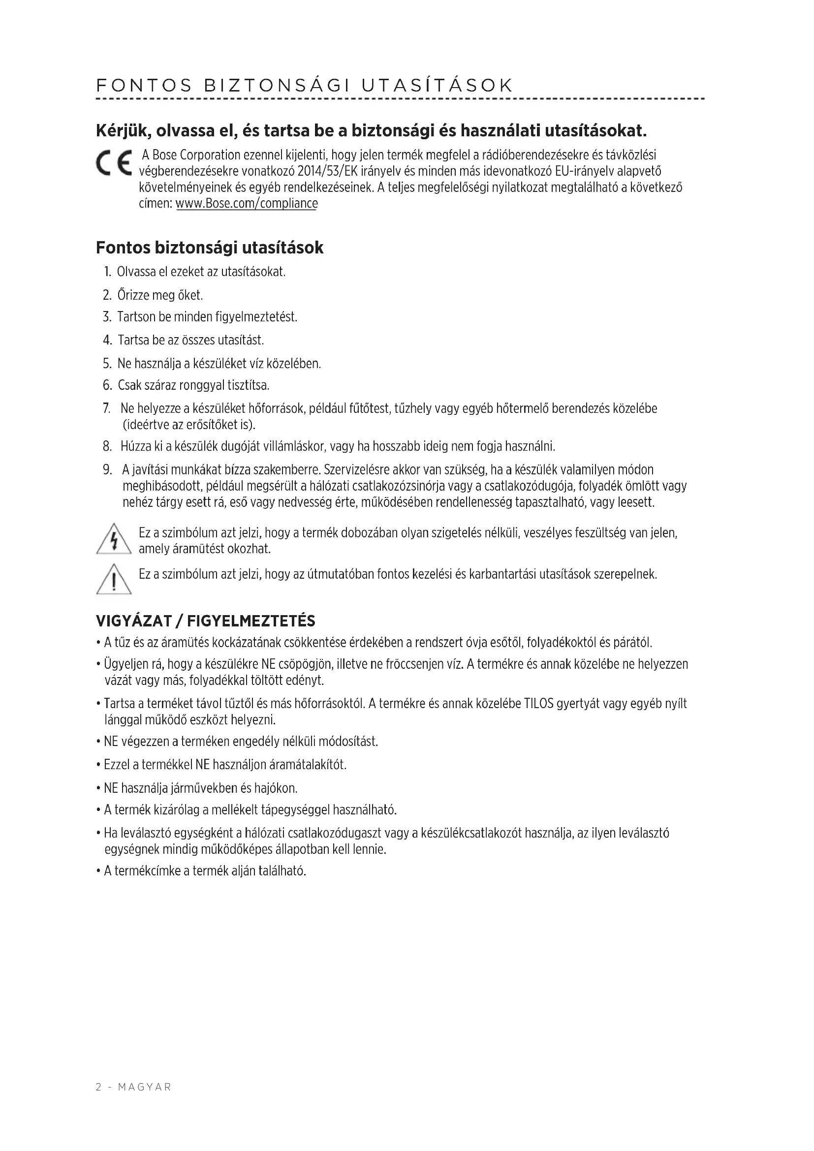 Kérjük, olvassa el, és tartsa be a biztonsági és használati utasításokat. A Bose Corporation ezennel kijelenti, hogy jelen termék megfelel a rádióberendezésekre és távközlési végberendezésekre vonatkozó 2014/53/EK irányelv és minden más idevonatkozó EU-irányelv alapvető követelményeinek és egyéb rendelkezéseinek. A teljes megfelelőségi nyilatkozat megtalálható a következő címen: www.Bose.com/compliance Fontos biztonsági utasítások