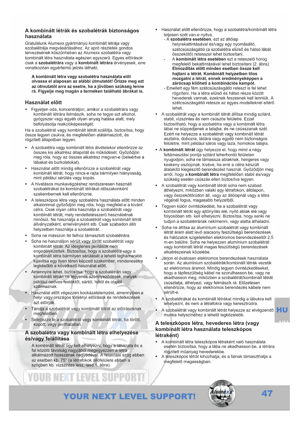 A teleszkópos letra vagy szobalétra használata elott minded alkalommal gyrozódjön meg rola, hogy megfele-l-a kívant celra. Csak olyan celra használja a szobalétrat vagy kombinalt letrát, mely rendeltetesszeru használatnak minosul. Ne használja a szobalétrat vagy kombinalt letrát allvanyatzként, emelvenyként stb. Csak szabadon alló helyzetben használja a szobalétrat. - Soha ne másszon fel falhoztámasztott szobalétrára.