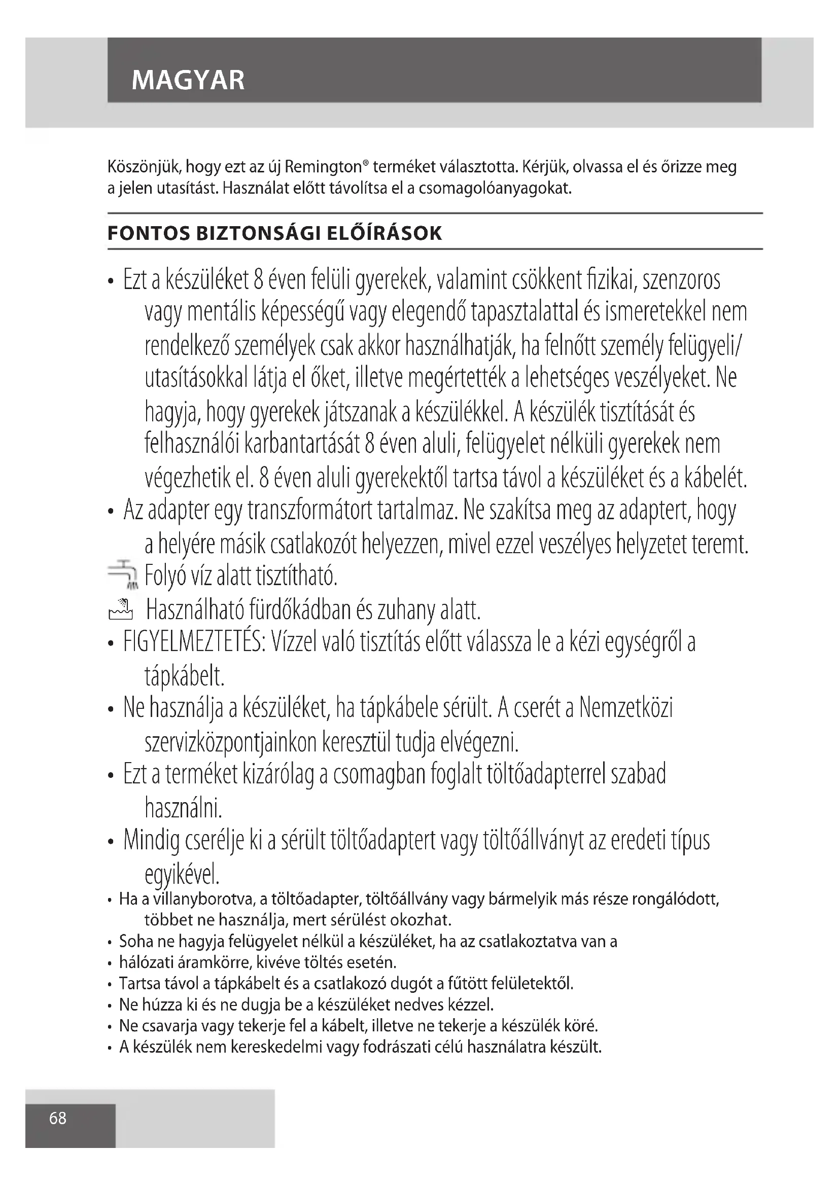 - Az adapter egy transzformátort tartalmaz. Ne szakítsa meg az adaptert, hogy a helyére másik csatlakozót helyezzen, mivel ezzel veszélyes helyzetet teremt. Folyó víz alatt tisztítható. E Használható fürdőkádban és zuhany alatt.