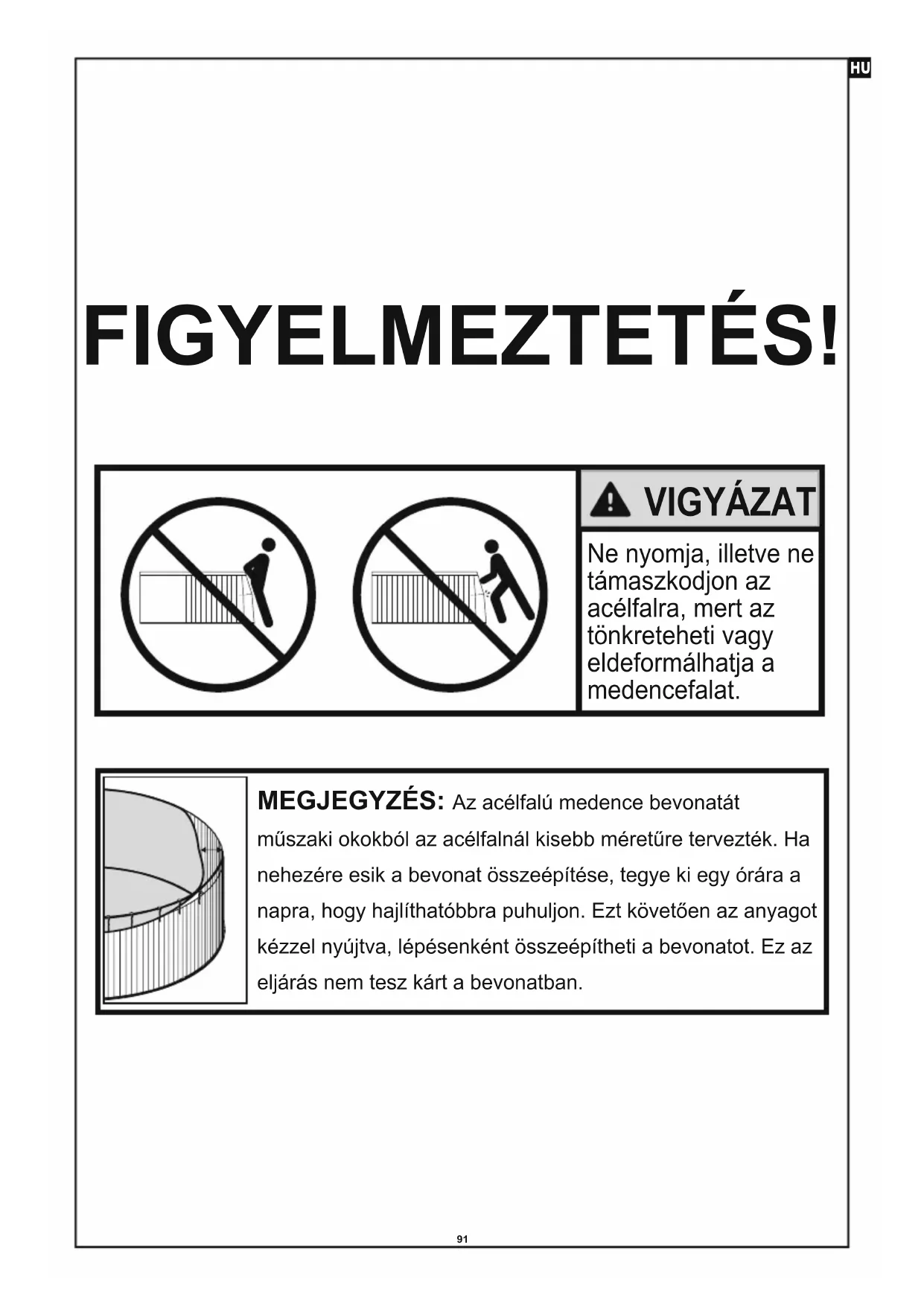 Az úszómedence telepítése és használata előtt gondosan olvassa el ezt a kézikönyvet, és értse meg, valamint tartsa be a benne foglaltakat. Ezek a figyelmeztetések, utasítások és biztonsági irányelvek segítenek elhárítani a vízi rekreációval kapcsolatos néhány általános kockázatot, de nem tudják lefedni az összes kockázatot és veszélyt. A vízi tevékenységek végzése során mindig legyen óvatos, megfontolt, és jó ítélőképességű. Tegye félre ezt a kézikönyvet, hogy a jövőben bármikor belenézhessen. Az úszni nem tudók biztonsága- A gyengén úszóknak és úszni nem tudóknak mindig hozzáértő felnőtt általi folyamatos, aktív és éber felügyeletet kell biztosítani (vegye figyelembe, hogy az öt év alatti gyermekeknél a legnagyobb a fulladásveszély).- A medence minden egyes használata alkalmával jelöljön ki hozzáértő felnőttet a medence felügyeletére.- A gyengén úszóknak, illetve úszni nem tudóknak a medence használatakor egyéni védőfelszerelést kell viselniük.- Ha az úszómedence nincs használatban, távolítson el belőle és a környezetéből minden játékot, hogy azok a gyermekeket nehogy a medencébe csalogassák. Biztonsági berendezések- A gyermekek megfulladásának elkerülése érdekében ajánlatos a medencéhez való hozzáférést védőeszközzel korlátozni. Annak érdekében, hogy a gyermekek ne ugrálhassanak a bemeneti és kimeneti szelepekről, tanácsos kerítéssel (és adott esetben az ajtók és ablakok bezárásával) megakadályozni az illetéktelenek medencéhez való hozzáférését.- A kerítések, medencefedelek, medenceriasztók, illetve hasonló biztonsági berendezések hasznos segítségek, de nem helyettesítik a hozzáértő felnőtt általi folyamatos felügyeletet. Biztonsági berendezések- A medence mellett tanácsos mentőfelszerelést (pl. mentőöv) tartani.- Tartson működőképes telefont és a segélyhívószám-listát amedence mellett. A medence biztonságos használata- Biztasson minden felhasználót – különösen a gyermekeket – hogytanuljanak meg úszni.- Tanulja meg az alapszintű elsősegélynyújtást (újraélesztés – CPR), és rendszeresen frissítse ezen ismereteit. Ez vészhelyzetben életet menthet.- Tájékoztassa az összes medencehasználót, hogy mit kell csinálni vészhelyzet esetén.- Soha ne ugorjon sekély vízbe. Ez súlyos sérüléshez vagy halálhoz vezethet.- Ne használja az úszómedencét, ha alkohol vagy gyógyszer hatása alatt áll, amely hatás hátrányosan befolyásolhatja a medence biztonságos használatát.- Medencefedél használata esetén a medencébe való beszállás előtt teljesen távolítsa el azt a vízfelületről.- A medencevíz kezelésével és jó higiéniai állapotának fenntartásával védje a medence használóit a vízen keresztül elkapható betegségektől. Tekintse meg a használati útmutatóban a vízkezelési irányelveket.- A vegyszerek (pl. vízkezelő szerek, tisztító vagy fertőtlenítő termékek) a gyermekek számára hozzáférhetetlen helyen tartandók!- Használja az alább leírt jelzést. A jelzést feltűnő helyen kell elhelyezni, a medence 2 méteres környezetében.- Ne hagyja a gyermekeket a vizes környezetben felügyelet nélkül. Merülni tilos!- Az eltávolítható létrákat vízszintes felületre kell helyezni.- Az úszómedencéhez használt anyagoktól függetlenül, a sérülések elkerülése érdekében a hozzáférhető felületeket rendszeresen ellenőrizni kell.- A sérülések elkerülése érdekében rendszeresen ellenőrizze a csavarok állapotát, távolítsa el a sorjákat, illetve szüntesse meg az éles peremeket. FIGYELEM: Ne hagyja a leürített medencét a szabadban. A medence üres állapotban könnyen deformálódhat, illetve a medencét könnyen arrébb fújhatja a szél.- Ha van szűrőszivattyúja, részletekért tekintse meg a szivattyú kézikönyvét.FIGYELMEZTETÉS! A szivattyú nem használható, ha ember van a medencében!- Ha van létrája, részletekért tekintse meg a létra kézikönyvét. FIGYELMEZTETÉS! Az úszómedence használata során tartsa be a használati és karbantartási útmutatójában foglalt biztonsági utasításokat. A fulladás, illetve egyéb súlyos sérülések megelőzése érdekében különösen figyeljen oda az úszómedence 5 éven aluli gyermekek általi nem várt hozzáférésének lehetőségére, és gondoskodjon arról, hogy a gyermekek ne férhessenek a medencéhez, valamint a fürdőzés ideje alatt folyamatosan felügyelje őket, vagy gondoskodjon felnőtt általi felügyeletükről. Alaposan olvassa el, és tegye félre, hogy a jövőben bármikor belenézhessen.01 02 0304 05 06 0710090811 12