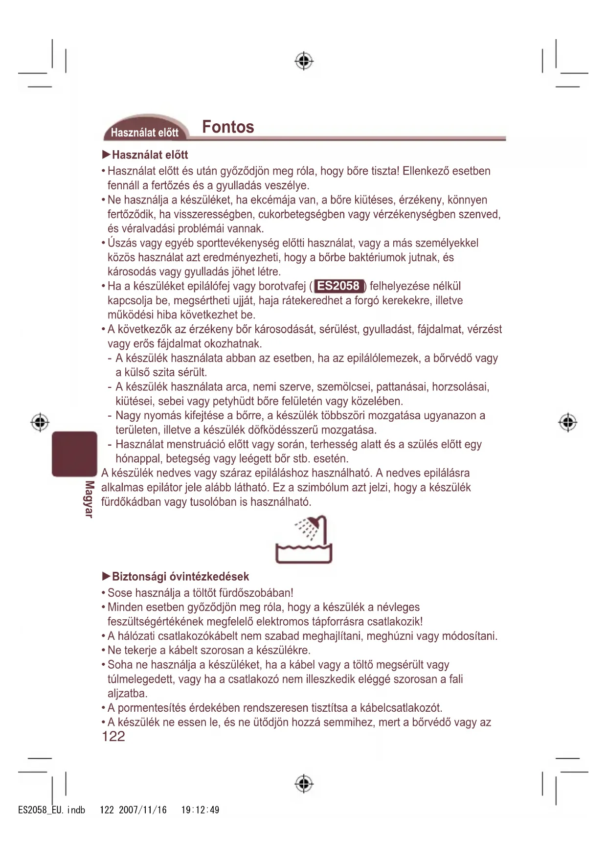 Buton de eliberare a cadrului Accesorii: Încărcător (RE7-44), perie de curăţare şi pungă (Vă rugăm să nu folosiţi alte accesorii decât cele furnizate.) ES2058_EU.indb 121 2007/11/16 19:12:48122 Magyar Fontos Használat előtt Használat előtt Használat előtt és után győződjön meg róla, hogy bőre tiszta! Ellenkező esetben fennáll a fertőzés és a gyulladás veszélye. Ne használja a készüléket, ha ekcémája van, a bőre kiütéses, érzékeny, könnyen fertőződik, ha visszerességben, cukorbetegségben vagy vérzékenységben szenved, és véralvadási problémái vannak. Úszás vagy egyéb sporttevékenység előtti használat, vagy a más személyekkel közös használat azt eredményezheti, hogy a bőrbe baktériumok jutnak, és károsodás vagy gyulladás jöhet létre. Ha a készüléket epilálófej vagy borotvafej ( ES2058 ) felhelyezése nélkül kapcsolja be, megsértheti ujját, haja rátekeredhet a forgó kerekekre, illetve működési hiba következhet be. A következők az érzékeny bőr károsodását, sérülést, gyulladást, fájdalmat, vérzést vagy erős fájdalmat okozhatnak. A készülék használata abban az esetben, ha az epilálólemezek, a bőrvédő vagy a külső szita sérült. A készülék használata arca, nemi szerve, szemölcsei, pattanásai, horzsolásai, kiütései, sebei vagy petyhüdt bőre felületén vagy közelében. Nagy nyomás kifejtése a bőrre, a készülék többszöri mozgatása ugyanazon a területen, illetve a készülék döfködésszerű mozgatása. Használat menstruáció előtt vagy során, terhesség alatt és a szülés előtt egy hónappal, betegség vagy leégett bőr stb. esetén. A készülék nedves vagy száraz epiláláshoz használható. A nedves epilálásra alkalmas epilátor jele alább látható. Ez a szimbólum azt jelzi, hogy a készülék fürdőkádban vagy tusolóban is használható. Biztonsági óvintézkedések Sose használja a töltőt fürdőszobában! Minden esetben győződjön meg róla, hogy a készülék a névleges feszültségértékének megfelelő elektromos tápforrásra csatlakozik! A hálózati csatlakozókábelt nem szabad meghajlítani, meghúzni vagy módosítani. Ne tekerje a kábelt szorosan a készülékre. Soha ne használja a készüléket, ha a kábel vagy a töltő megsérült vagy túlmelegedett, vagy ha a csatlakozó nem illeszkedik eléggé szorosan a fali aljzatba. A pormentesítés érdekében rendszeresen tisztítsa a kábelcsatlakozót. A készülék ne essen le, és ne ütődjön hozzá semmihez, mert a bőrvédő vagy az