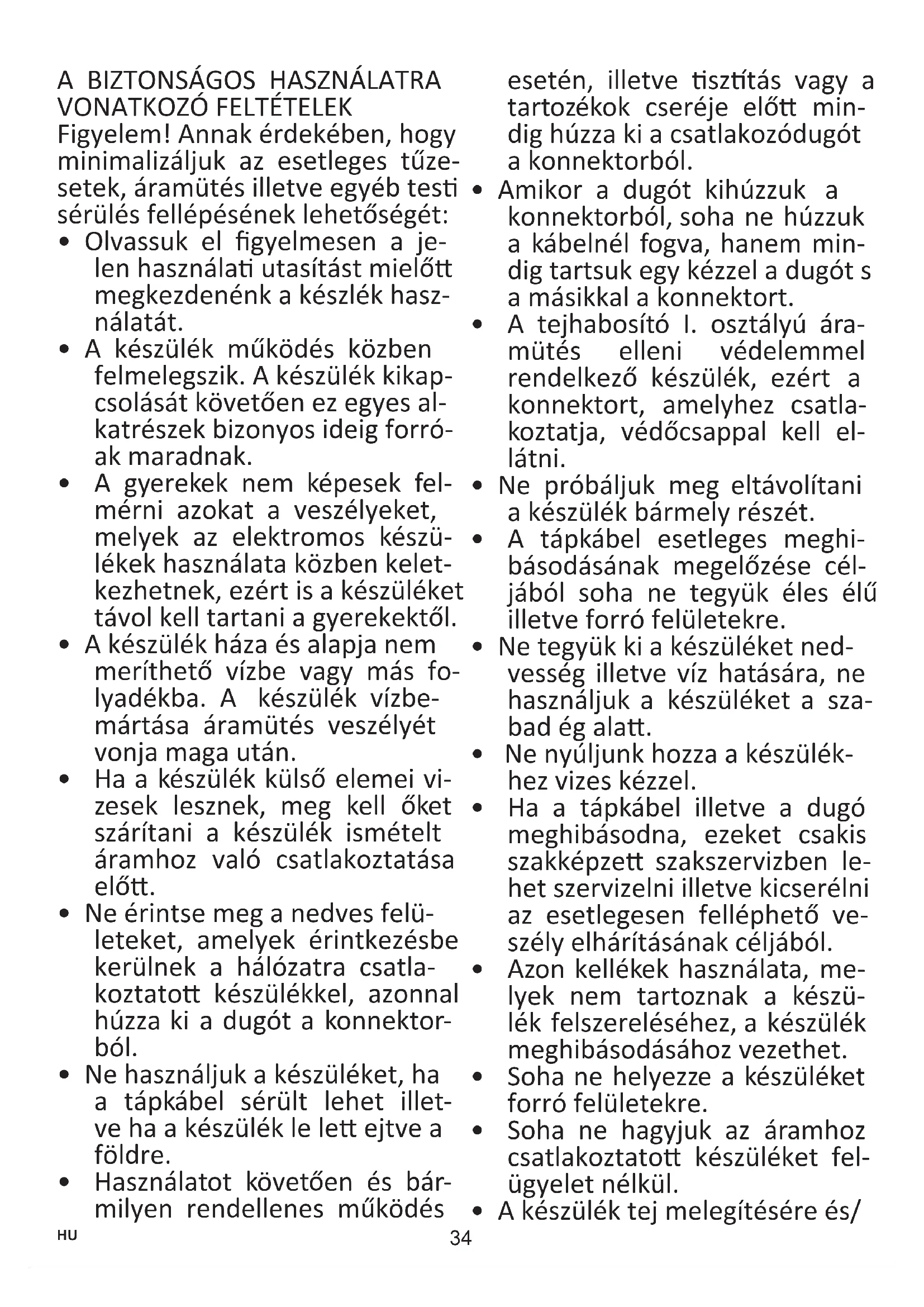- A készülék háza és alapja nem meríthető vízbe vagy más fo- lyadékba. A készülék vízbe- mártása áramütés veszélyét vonja maga után.