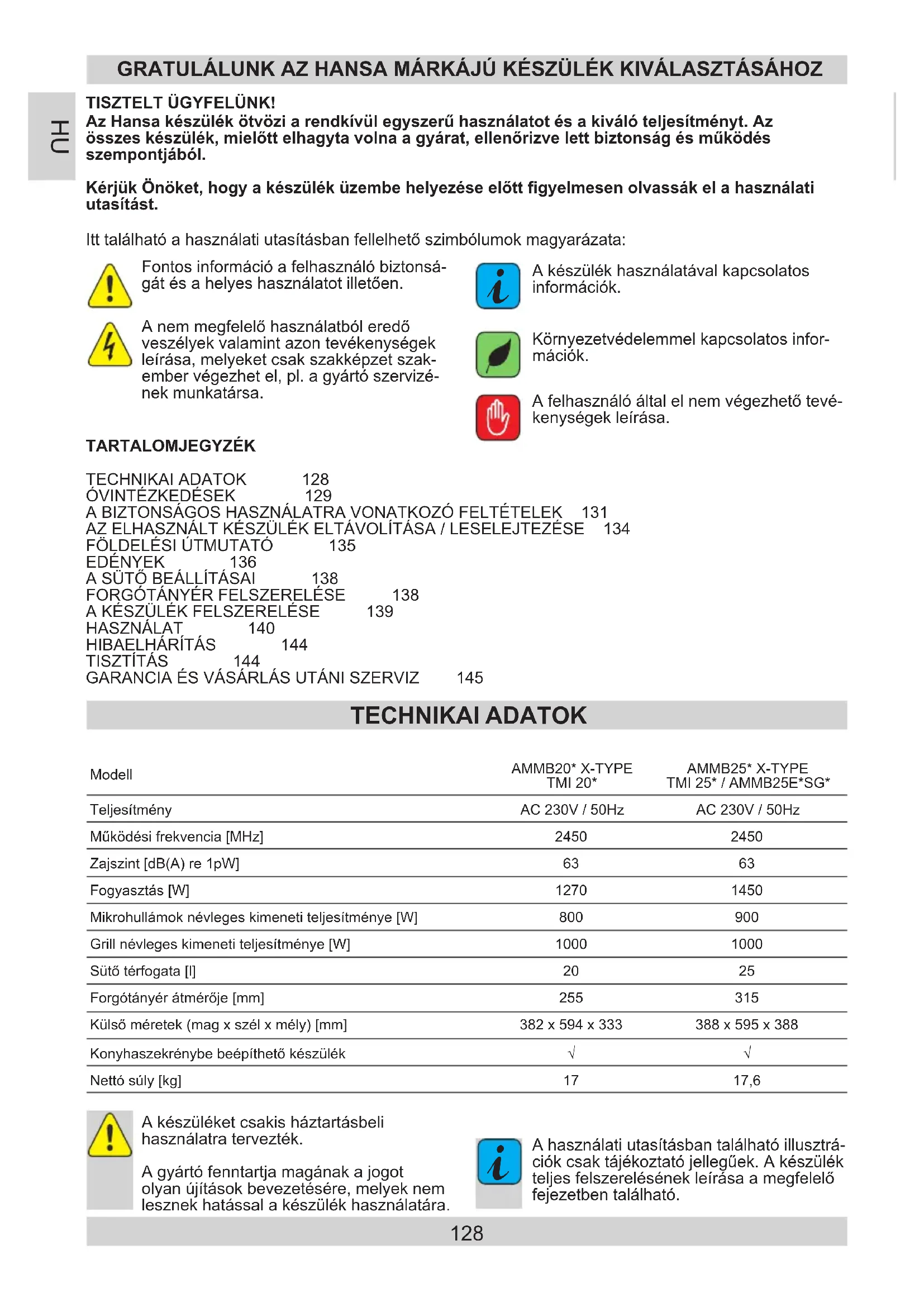 A használati utasításban található illusztrá- ciók csak tájékoztató jellegűek. A készülék teljes felszerelésének leírása a megfelelő fejezetben található. TECHNIKAI ADATOK TARTALOMJEGYZÉK TECHNIKAI ADATOK 128