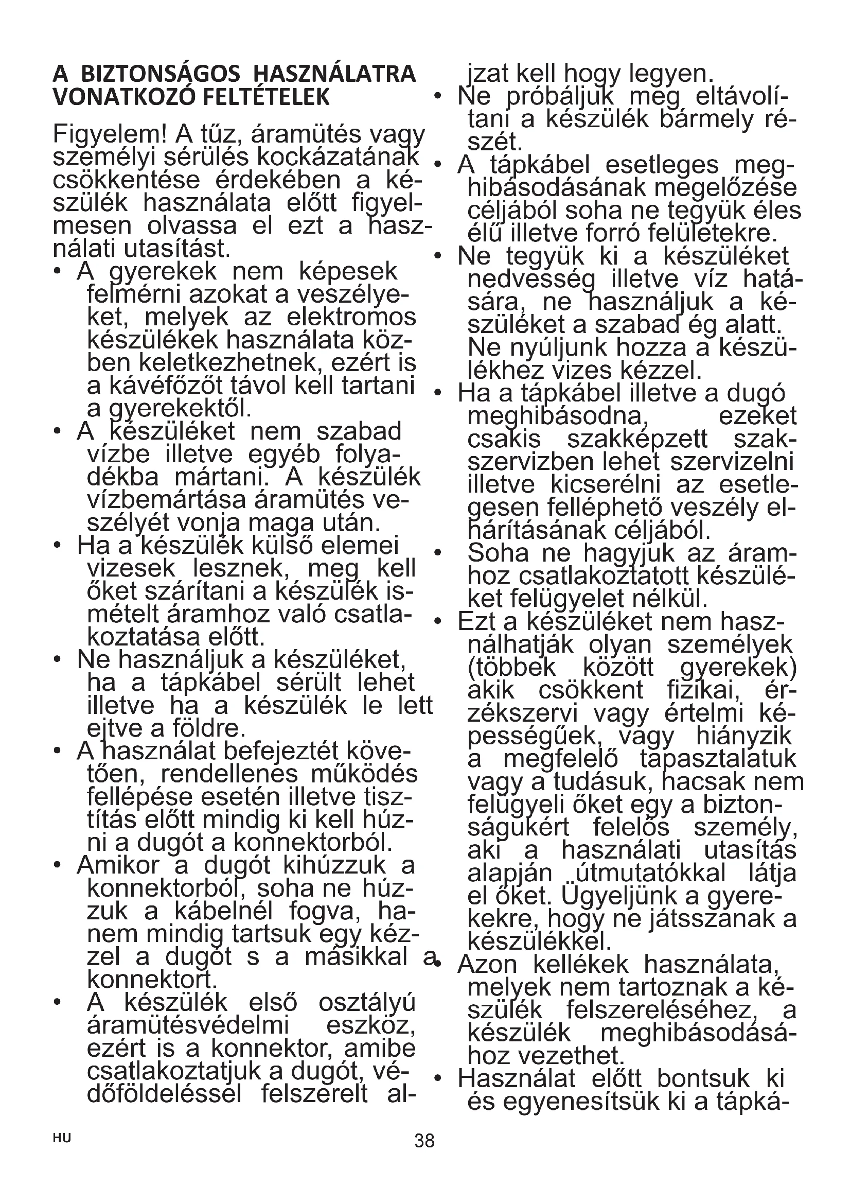 - A gyerekek nem képesek felmérni azokat a veszélye- ket, melyek az elektromos készülékek használata köz- ben keletkezhetnek, ezért is a kávéfőzőt távol kell tartani a gyerekektől.