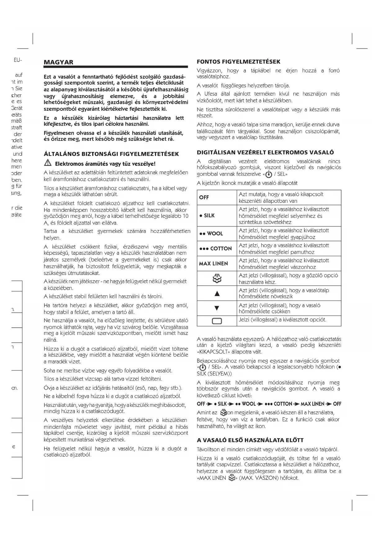 MAGYAR Ezt a vasalót a fenntartható fejlődést szolgáló gazdasá- gossági szempontok szerint, a termék teljes életciklusát az alapanyag kiválasztásától a későbbi újrafelhasználásig vagy újrahasznosításig elemezve, és a jobbítási lehetőségeket műszaki, gazdasági és környezetvédelmi szempontból egyaránt kiértékelve fejlesztették ki. Ez a készülék kizárólag háztartási használatra lett kifejlesztve, és tilos ipari célokra használni. Figyelmesen olvassa el a készülék használati utasítását, és őrizze meg, mert később még szüksége lehet rá.