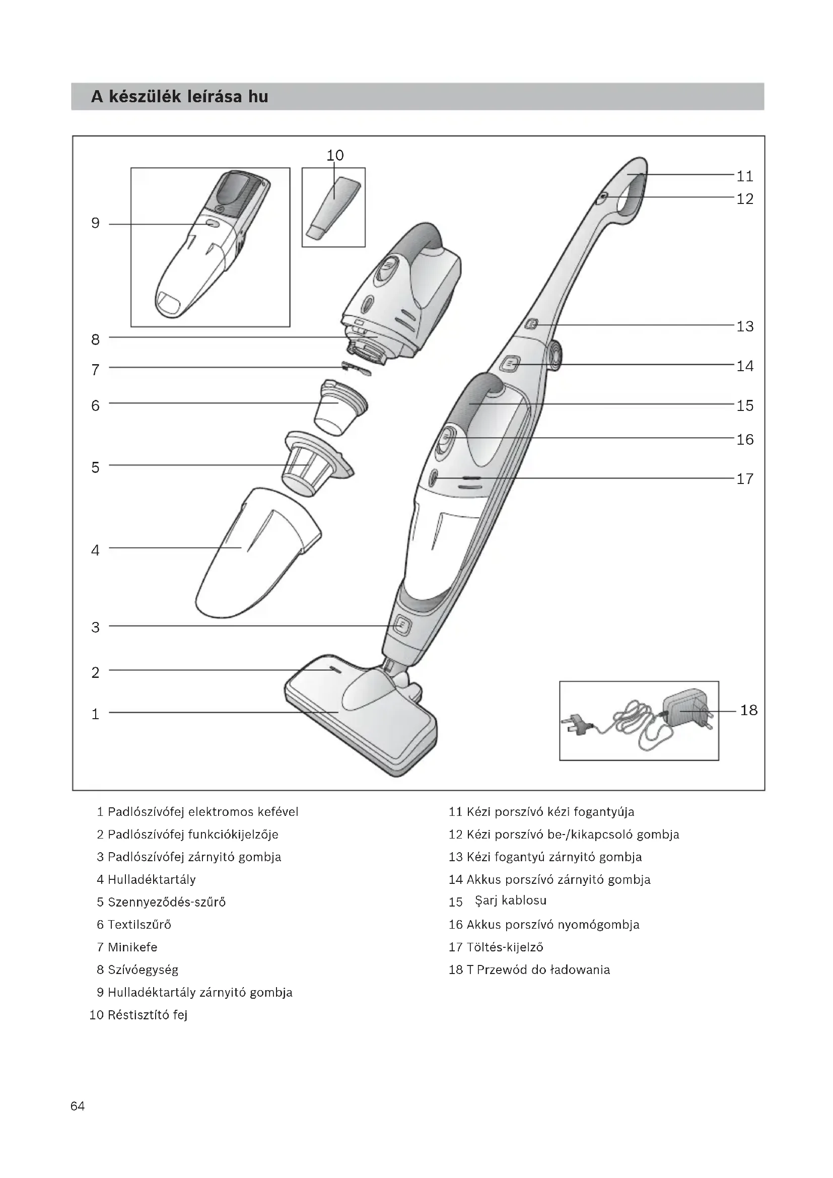 1 Padlószívófej elektromos kefével 2 Padlószívófej funkciókijelzője 3 Padlószívófej zárnyitó gombja 4 Hulladéktartály 5 Szennyeződés-szűrő 6 Textilszűrő 7 Minikefe 8 Szívóegység 9 Hulladéktartály zárnyitó gombja 10 Réstisztító fej 11 Kézi porszívó kézi fogantyúja 12 Kézi porszívó be-/kikapcsoló gombja 13 Kézi fogantyú zárnyitó gombja 14 Akkus porszívó zárnyitó gombja 15 Akkus porszívó kézi fogantyúja 16 Akkus porszívó nyomógombja 17 Töltés-kijelző 18 Töltőállomás 19 Töltőállomás padlótartója 20 Töltőkábel Şarj kablosu A készülék leírása hu Przewód do ładowania65
