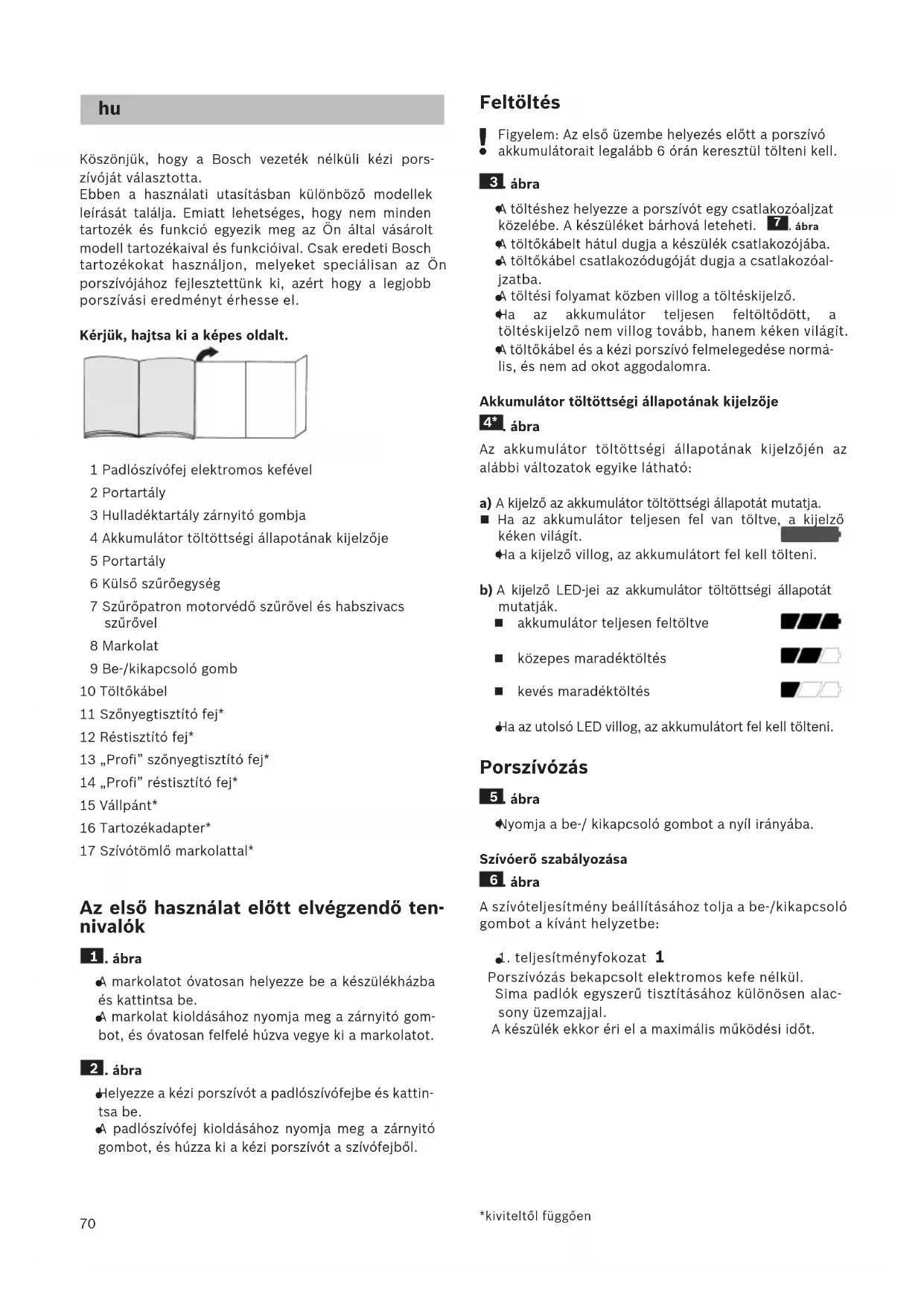 Köszönjük, hogy a Bosch vezeték nélküli kézi pors- zívóját választotta. Ebben a használati utasításban különböző modellek leírását találja. Emiatt lehetséges, hogy nem minden tartozék és funkció egyezik meg az Ön által vásárolt modell tartozékaival és funkcióival. Csak eredeti Bosch tartozékokat használjon, melyeket speciálisan az Ön porszívójához fejlesztettünk ki, azért hogy a legjobb porszívási eredményt érhesse el. Kérjük, hajtsa ki a képes oldalt. 1 Padlószívófej elektromos kefével 2 Portartály 3 Hulladéktartály zárnyitó gombja 4 Akkumulátor töltöttségi állapotának kijelzője 5 Portartály 6 Külső szűrőegység 7 Szűrőpatron motorvédő szűrővel és habszivacs szűrővel 8 Markolat 9 Be-/kikapcsoló gomb 10 Töltőkábel 11 Szőnyegtisztító fej* 12 Réstisztító fej* 13 „Profi” szőnyegtisztító fej* 14 „Profi” réstisztító fej* 15 Vállpánt* 16 Tartozékadapter* 17 Szívótömlő markolattal* Az első használat előtt elvégzendő ten- nivalók