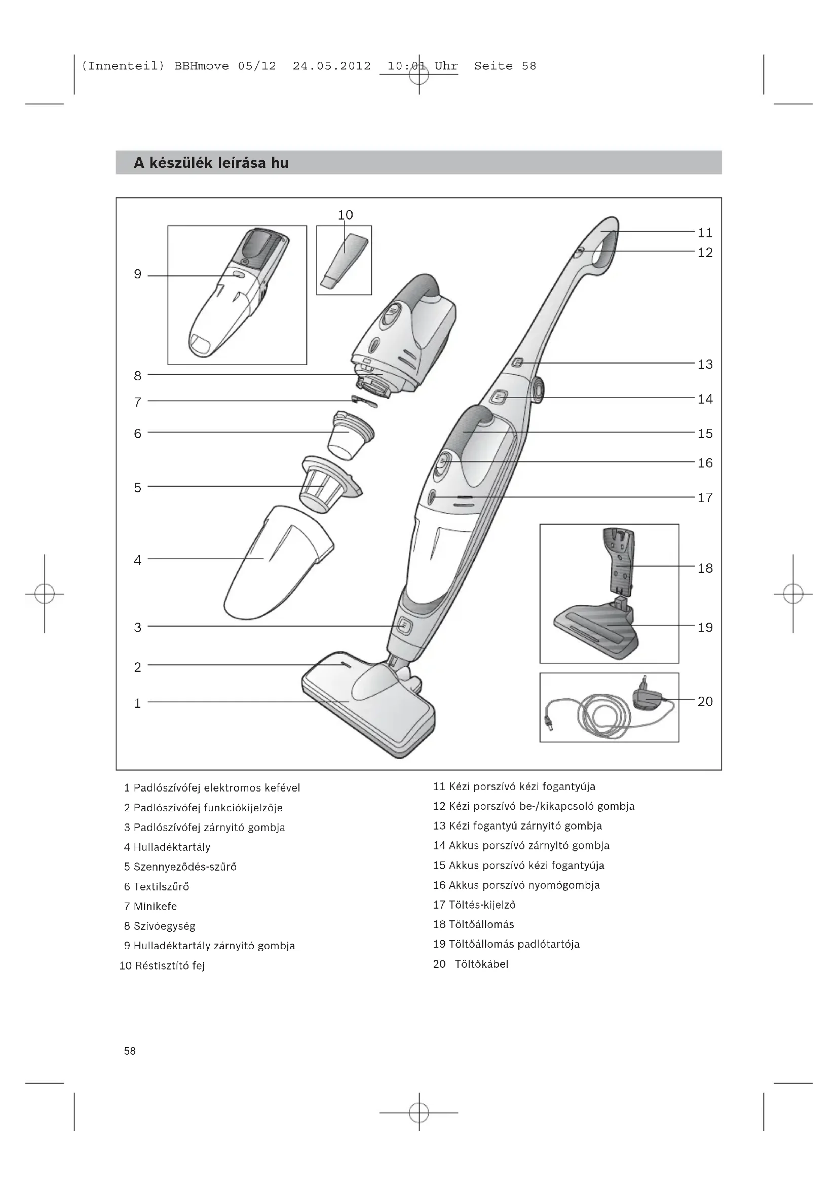 (Innenteil) BBHmove 05/12 24.05.2012 10:01 Uhr Seite 5758 A készülék leírása hu 1 Padlószívófej elektromos kefével 2 Padlószívófej funkciókijelzője 3 Padlószívófej zárnyitó gombja 4 Hulladéktartály 5 Szennyeződés-szűrő 6 Textilszűrő 7 Minikefe 8 Szívóegység 9 Hulladéktartály zárnyitó gombja 10 Réstisztító fej 11 Kézi porszívó kézi fogantyúja 12 Kézi porszívó be-/kikapcsoló gombja 13 Kézi fogantyú zárnyitó gombja 14 Akkus porszívó zárnyitó gombja 15 Akkus porszívó kézi fogantyúja 16 Akkus porszívó nyomógombja 17 Töltés-kijelző 18 Töltőállomás 19 Töltőállomás padlótartója 20 Töltőkábel
