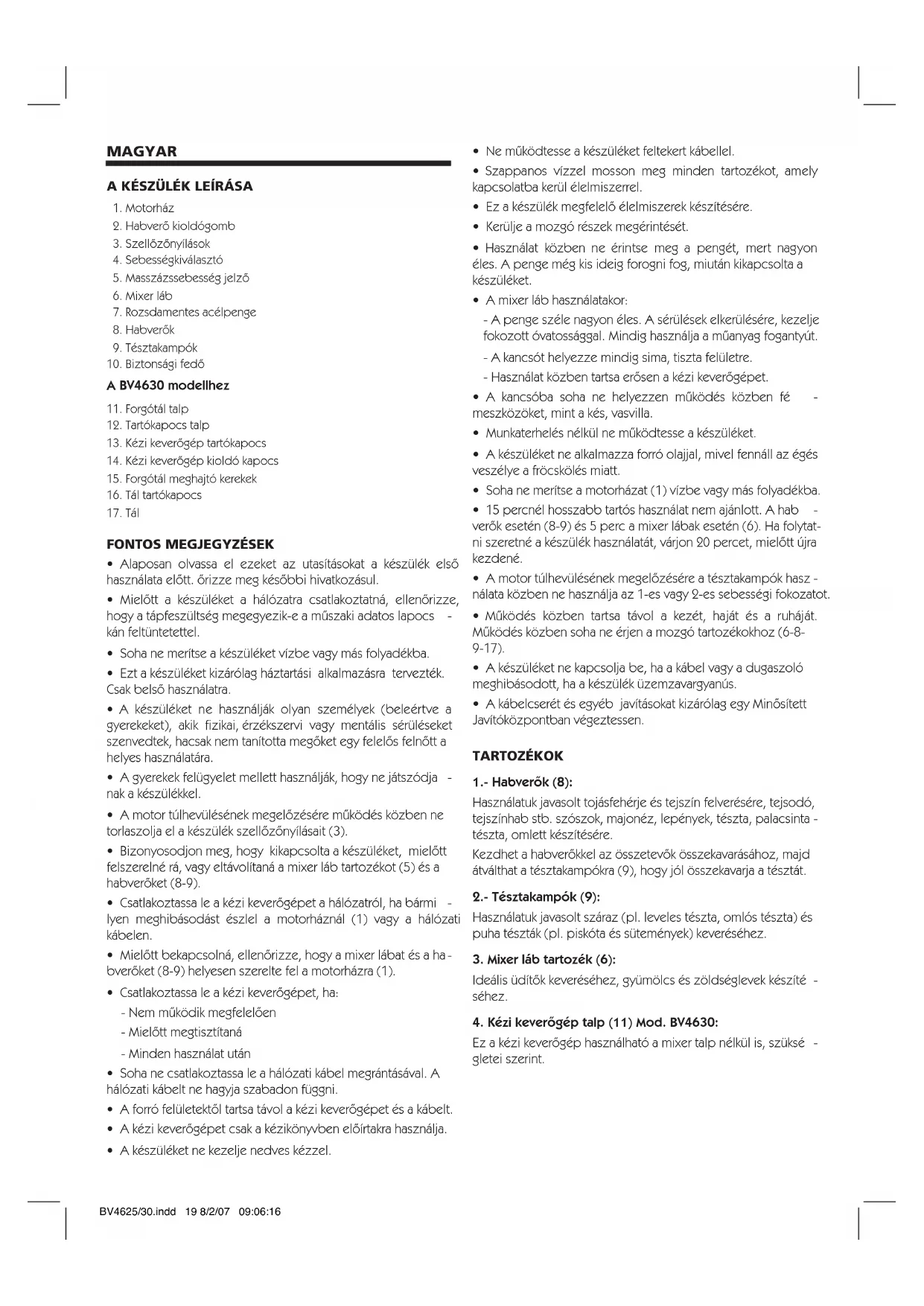 gletei szerint. BV4625/30.indd 19 8/2/07 09:06:16A KÉZI KEVERŒGÉP KÉZI ALKALMAZÁSA BV-4625 & BV-4630 HabverŒk és tésztakampók: Illessze be a habverŒket (8) vagy a tésztakampókat (9) egyik kézben tartván a keverŒgép fogantyúját, és a másik kezében a mixer láb nyelét. Illessze be a lábnyílásokba a nyelet (1), csúsztatva forgatván, hogy betaláljon a helyére. Tegye ugyanazt a másik láb csatolásához. MielŒtt a kézi ke