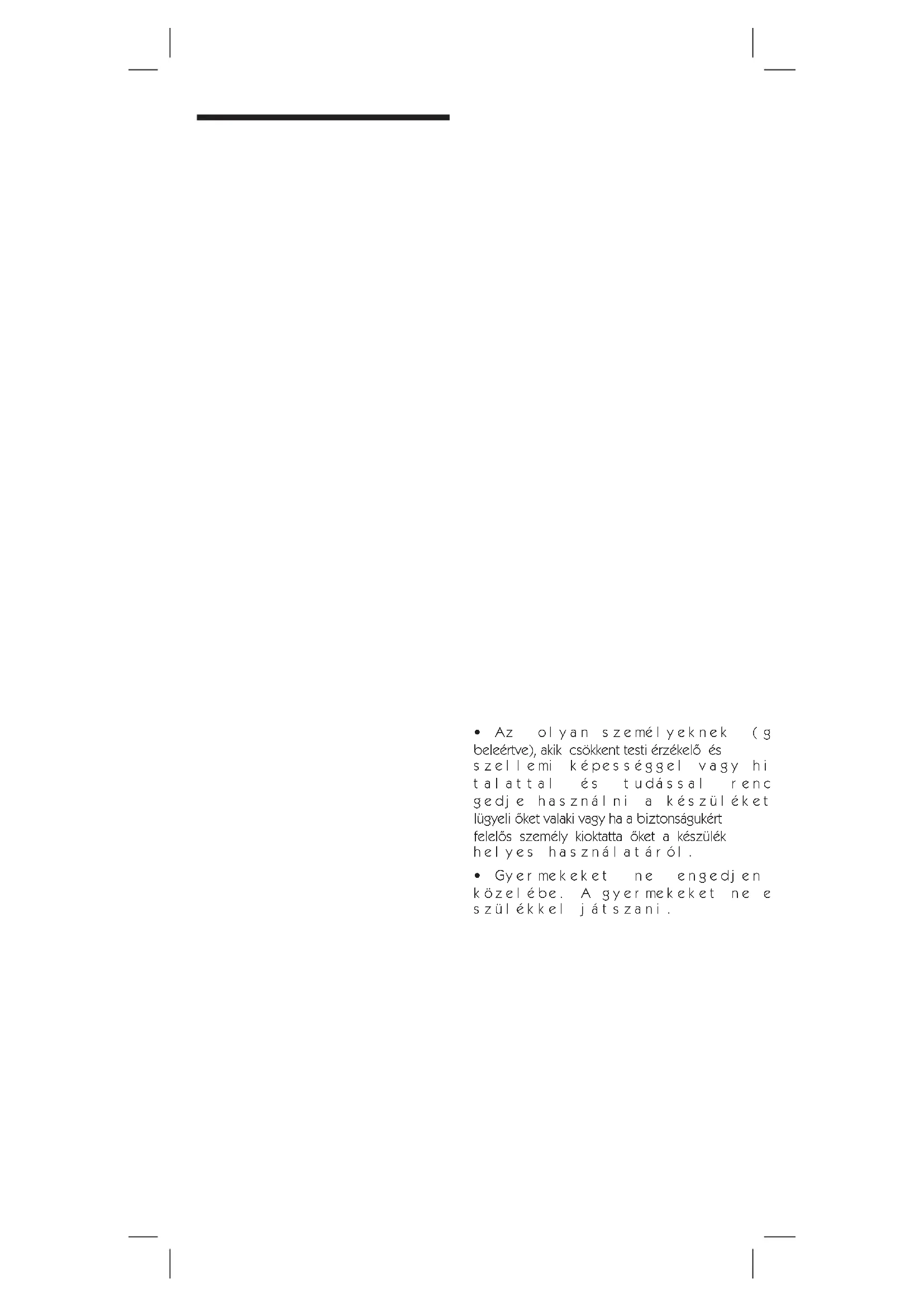 - Az olyanszemélyeknek (gyermekeketis beleértve), akik csökkent testi érzékelő és szellemiképességgelvagyhiányostapasz talattal és tudással rendelkeznek, ne en gedjehasználniakészüléket,kivéve,hafe lügyeli őket valaki vagy ha a biztonságukért felelős személy kioktatta őket a készülék helyeshasználatáról.