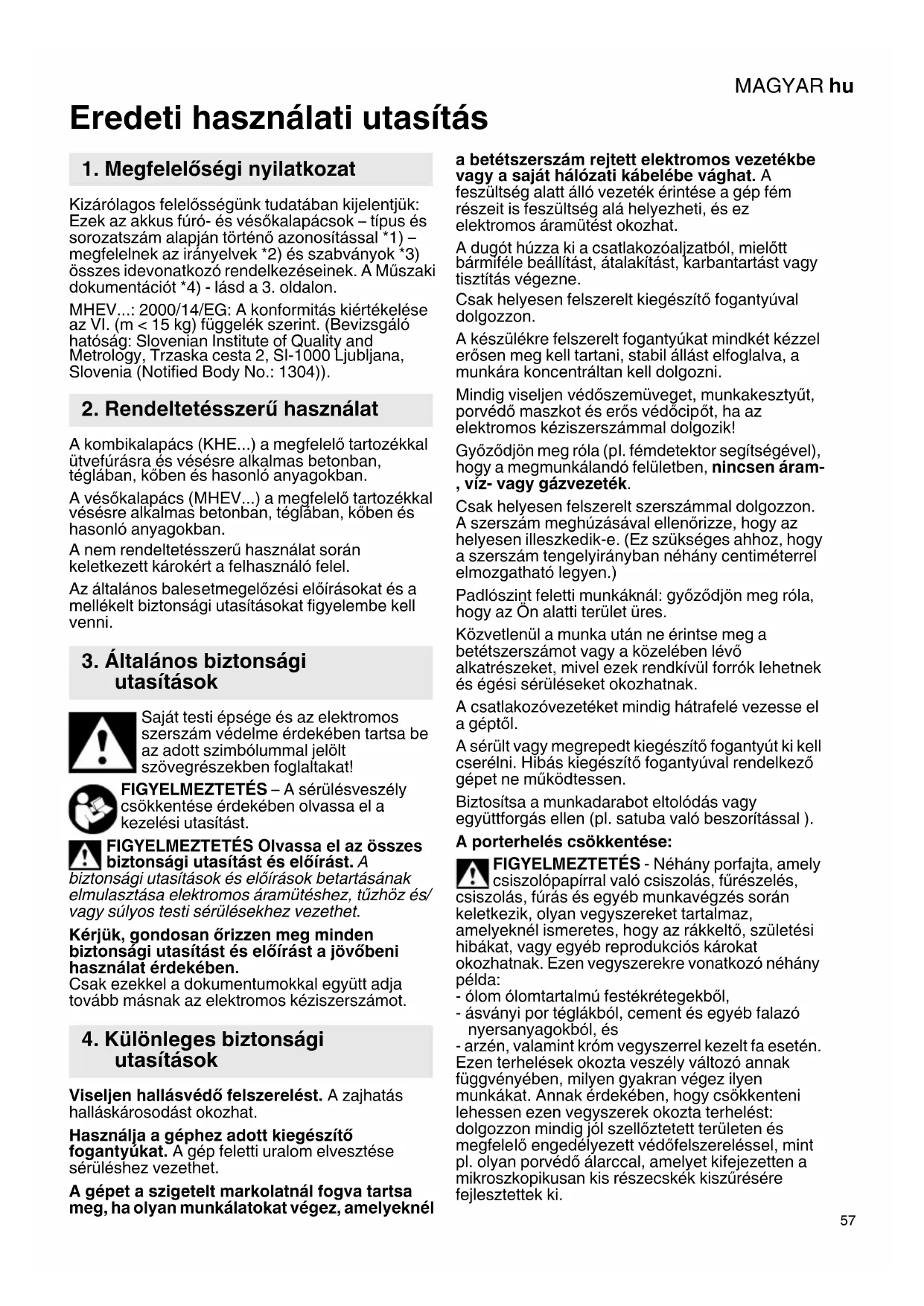 Eredeti használati utasítás Kizárólagos felelősségünk tudatában kijelentjük: Ezek az akkus fúró- és vésőkalapácsok – típus és sorozatszám alapján történő azonosítással *1) – megfelelnek az irányelvek *2) és szabványok *3) összes idevonatkozó rendelkezéseinek. A Műszaki dokumentációt *4) - lásd a 3. oldalon. MHEV...: 2000/14/EG: A konformitás kiértékelése az VI. (m < 15 kg) függelék szerint. (Bevizsgáló hatóság: Slovenian Institute of Quality and Metrology, Trzaska cesta 2, SI-1000 Ljubljana, Slovenia (Notified Body No.: 1304)). A kombikalapács (KHE...) a megfelelő tartozékkal ütvefúrásra és vésésre alkalmas betonban, téglában, kőben és hasonló anyagokban. A vésőkalapács (MHEV...) a megfelelő tartozékkal vésésre alkalmas betonban, téglában, kőben és hasonló anyagokban. A nem rendeltetésszerű használat során keletkezett károkért a felhasználó felel. Az általános balesetmegelőzési előírásokat és a mellékelt biztonsági utasításokat figyelembe kell venni. Saját testi épsége és az elektromos szerszám védelme érdekében tartsa be az adott szimbólummal jelölt szövegrészekben foglaltakat! FIGYELMEZTETÉS – A sérülésveszély csökkentése érdekében olvassa el a kezelési utasítást. FIGYELMEZTETÉS Olvassa el az összes biztonsági utasítást és előírást. A biztonsági utasítások és előírások betartásának elmulasztása elektromos áramütéshez, tűzhöz és/ vagy súlyos testi sérülésekhez vezethet. Kérjük, gondosan őrizzen meg minden biztonsági utasítást és előírást a jövőbeni használat érdekében. Csak ezekkel a dokumentumokkal együtt adja tovább másnak az elektromos kéziszerszámot. Viseljen hallásvédő felszerelést. A zajhatás halláskárosodást okozhat. Használja a géphez adott kiegészítő fogantyúkat. A gép feletti uralom elvesztése sérüléshez vezethet. A gépet a szigetelt markolatnál fogva tartsa meg, ha olyan munkálatokat végez, amelyeknél a betétszerszám rejtett elektromos vezetékbe vagy a saját hálózati kábelébe vághat. A feszültség alatt álló vezeték érintése a gép fém részeit is feszültség alá helyezheti, és ez elektromos áramütést okozhat. A dugót húzza ki a csatlakozóaljzatból, mielőtt bármiféle beállítást, átalakítást, karbantartást vagy tisztítás végezne. Csak helyesen felszerelt kiegészít ő fogantyúval dolgozzon. A készülékre felszerelt fogantyúkat mindkét kézzel erősen meg kell tartani, stabil állást elfoglalva, a munkára koncentráltan kell dolgozni. Mindig viseljen védőszemüveget, munkakesztyűt, porvédő maszkot és erős védőcipőt, ha az elektromos kéziszerszámmal dolgozik! Győződjön meg róla (pl. fémdetektor segítségével), hogy a megmunkálandó felületben, nincsen áram- , víz- vagy gázvezeték. Csak helyesen felszerelt szerszámmal dolgozzon. A szerszám meghúzásával ellenőrizze, hogy az helyesen illeszkedik-e. (Ez szükséges ahhoz, hogy a szerszám tengelyirányban néhány centiméterrel elmozgatható legyen.) Padlószint feletti munkáknál: győződjön meg róla, hogy az Ön alatti terület üres. Közvetlenül a munka után ne érintse meg a betétszerszámot vagy a közelében lévő alkatrészeket, mivel ezek rendkívül forrók lehetnek és égési sérüléseket okozhatnak. A csatlakozóvezetéket mindig hátrafelé vezesse el a géptől. A sérült vagy megrepedt kiegészítő fogantyút ki kell cserélni. Hibás kiegészítő fogantyúval rendelkező gépet ne működtessen. Biztosítsa a munkadarabot eltolódás vagy együttforgás ellen (pl. satuba való beszorítással ). A porterhelés csökkentése: FIGYELMEZTETÉS - Néhány porfajta, amely csiszolópapírral való csiszolás, fűrészelés, csiszolás, fúrás és egyéb munkavégzés során keletkezik, olyan vegyszereket tartalmaz, amelyeknél ismeretes, hogy az rákkeltő, születési hibákat, vagy egyéb reprodukciós károkat okozhatnak. Ezen vegyszerekre vonatkozó néhány példa: - ólom ólomtartalmú festékrétegekből, - ásványi por téglákból, cement és egyéb falazó nyersanyagokból, és - arzén, valamint króm vegyszerrel kezelt fa esetén. Ezen terhelések okozta veszély változó annak függvényében, milyen gyakran végez ilyen munkákat. Annak érdekében, hogy csökkenteni lehessen ezen vegyszerek okozta terhelést: dolgozzon mindig jól szellőztetett területen és megfelelő engedélyezett védőfelszereléssel, mint pl. olyan porvédő álarccal, amelyet kifejezetten a mikroszkopikusan kis részecskék kiszűrésére fejlesztettek ki.