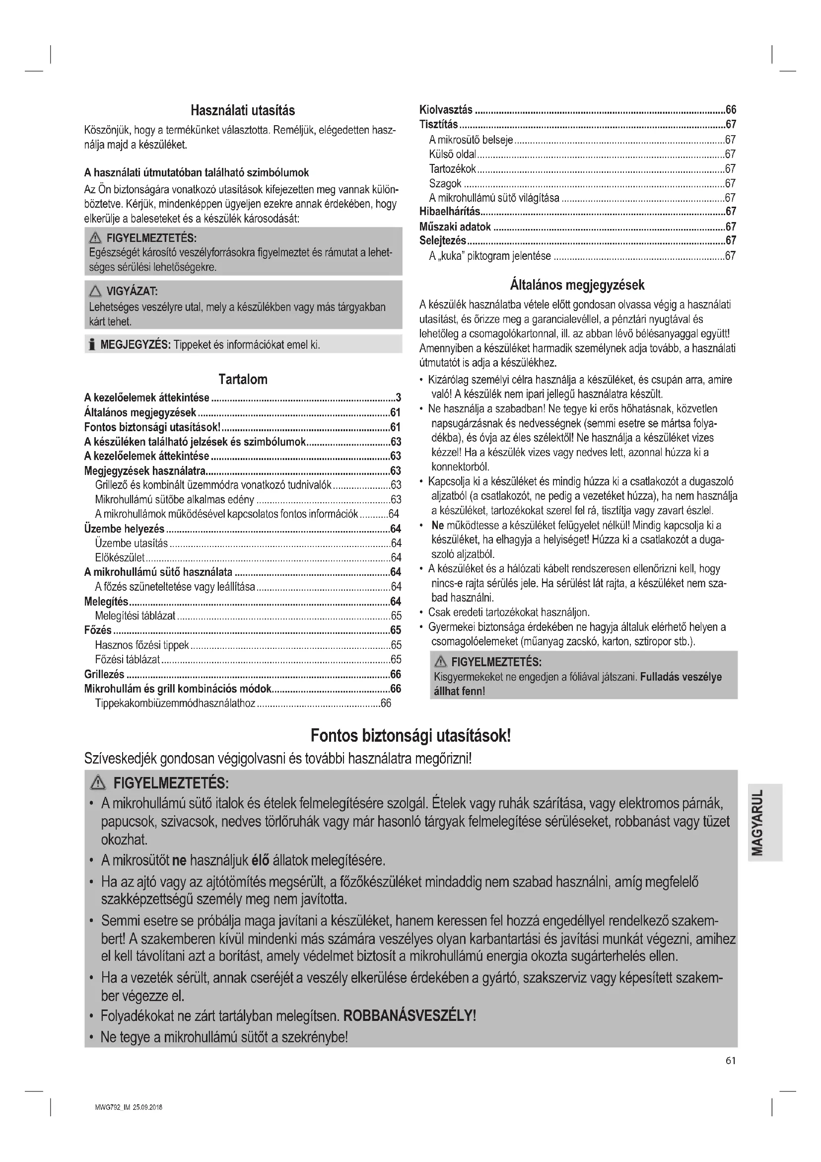 - Ne tegye a mikrohullámú sütőt a szekrénybe!62 MWG792_IM 25.09.2018 FIGYELMEZTETÉS: