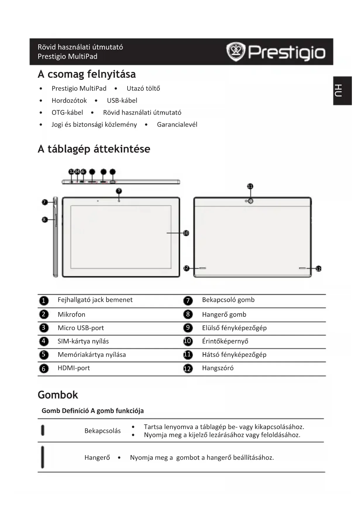 - Nyomjamegakijelzőlezárásáhozvagyfeloldásához. Hangerő • Nyomjamegagombotahangerőbeállításához.HU Rövid használati útmutató Prestigio MultiPad Vissza