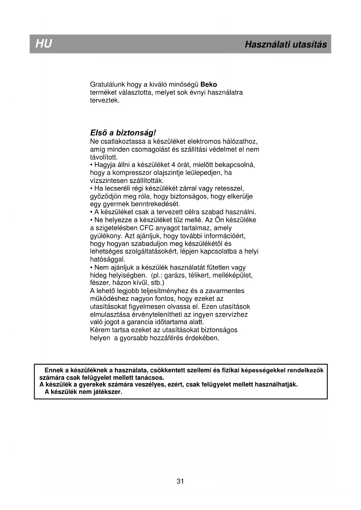 Ennek a készüléknek a használata, csökkentett szellemi és fizikai képességekkel rendelkezők számára csak felügyelet mellett tanácsos. A készülék a gyerekek számára veszélyes, ezért, csak felügyelet mellett használhatják. A készülék nem játékszer.