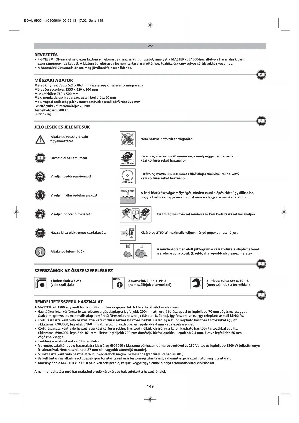 - Amennyiben a MASTER cut 1500-at le kell selejteznie, kérjük, vegye figyelembe a helyi ártalmatlanítási előírásokat. A nem rendeltetésszerű használatból eredő károkért és balesetekért a használó felel. Kizárólag 2760 W maximális teljesítményű gépeket használjon. BDAL 6906_116306906 05.08.13 17:32 Seite 149150