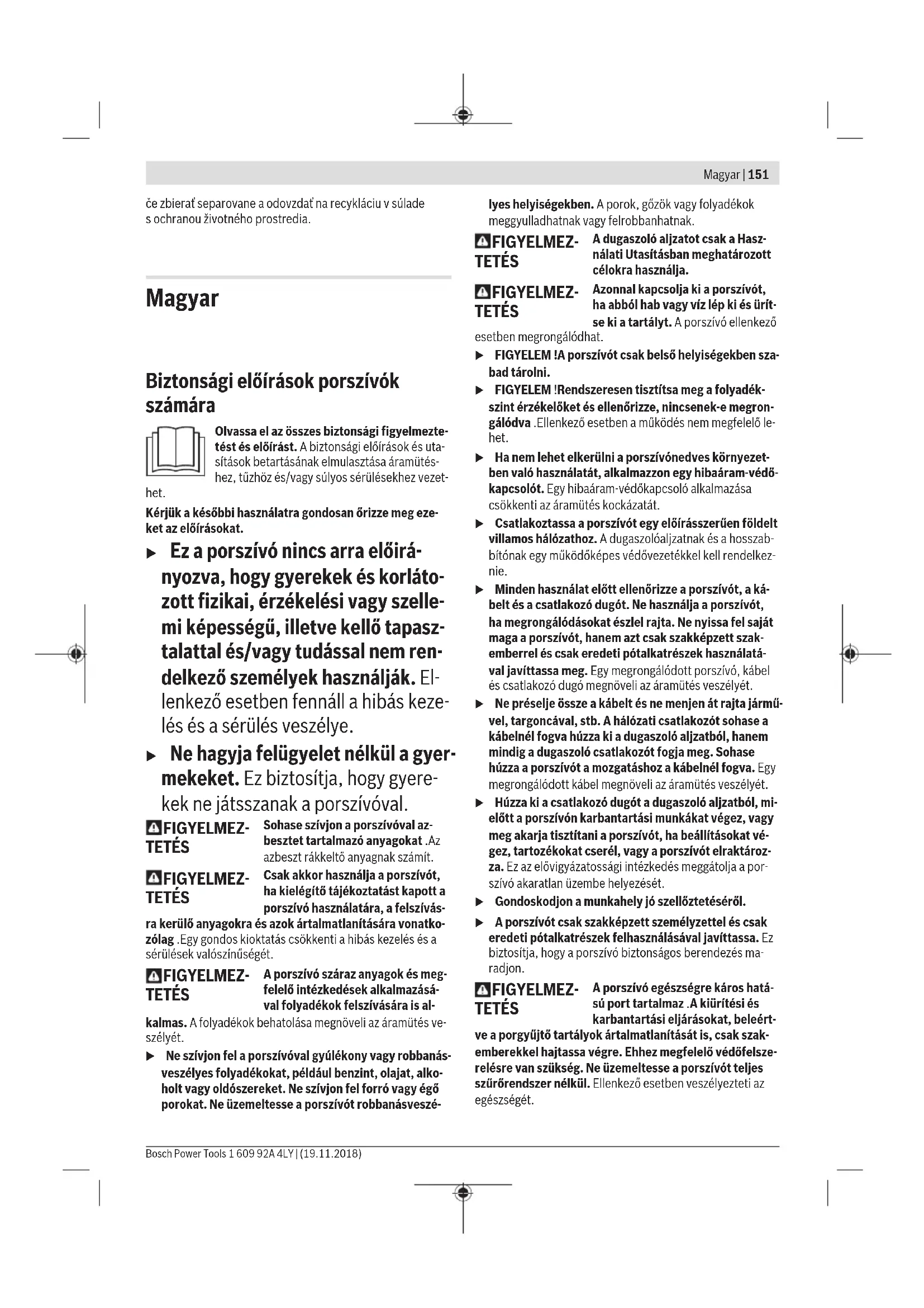 Zákaznícka služba aporadenstvo ohľadom použitia Servisné stredisko Vám odpovie na otázky týkajúce sa opravy aúdržby Vášho produktu ako aj náhradných dielov. Rozkladové výkresy ainformácie onáhradných dieloch náj- dete tiež na: www.bosch-pt.com Vprípade otázok týkajúcich sa našich výrobkov apríslušen- stva Vám ochotne pomôže poradenský tím Bosch. Vprípade akýchkoľvek otázok aobjednávok náhradných súčiastok uvádzajte bezpodmienečne 10‑miestne vecné číslo uvedené na typovom štítku výrobku. Slovakia Na www.bosch-pt.sk si môžete objednať opravu vášho stroja alebo náhradné diely online. Tel.: +421 2 48 703 800 Fax: +421 2 48 703 801 E-Mail: servis.naradia@sk.bosch.com www.bosch-pt.sk Likvidácia Vysávač, príslušenstvo aobaly treba dať na recykláciu zod- povedajúcu ochrane životného prostredia. Nevyhadzujte vysávač do bežného odpadu zdomácnosti! Len pre krajinyEÚ: Podľa európskej smernice 2012/19/EÚ oodpade zelektrických aelektronických zariadení apodľa jej trans- pozície vnárodnom práve sa musia už nepoužiteľné vysáva-če zbierať separovane aodovzdať na recykláciu vsúlade sochranou životného prostredia. Magyar Biztonsági előírások porszívók számára Olvassa el az összes biztonsági figyelmezte- tést és előírást. A biztonsági előírások és uta- sítások betartásának elmulasztása áramütés- hez, tűzhöz és/vagy súlyos sérülésekhez vezet- het. Kérjük a későbbi használatra gondosan őrizze meg eze- ket az előírásokat. u Ez a porszívó nincs arra előirá- nyozva, hogy gyerekek és korláto- zott fizikai, érzékelési vagy szelle- mi képességű, illetve kellő tapasz- talattal és/vagy tudással nem ren- delkező személyek használják. El- lenkező esetben fennáll a hibás keze- lés és a sérülés veszélye. u Ne hagyja felügyelet nélkül a gyer- mekeket. Ez biztosítja, hogy gyere- kek ne játsszanak a porszívóval. FIGYELMEZ- TETÉS Sohase szívjon a porszívóval az- besztet tartalmazó anyagokat .Az azbeszt rákkeltő anyagnak számít. FIGYELMEZ- TETÉS Csak akkor használja a porszívót, ha kielégítő tájékoztatást kapott a porszívó használatára, a felszívás- ra kerülő anyagokra és azok ártalmatlanítására vonatko- zólag .Egy gondos kioktatás csökkenti a hibás kezelés és a sérülések valószínűségét. FIGYELMEZ- TETÉS A porszívó száraz anyagok és meg- felelő intézkedések alkalmazásá- val folyadékok felszívására is al- kalmas. A folyadékok behatolása megnöveli az áramütés ve- szélyét. u Ne szívjon fel a porszívóval gyúlékony vagy robbanás- veszélyes folyadékokat, például benzint, olajat, alko- holt vagy oldószereket. Ne szívjon fel forró vagy égő porokat. Ne üzemeltesse a porszívót robbanásveszé- lyes helyiségekben. A porok, gőzök vagy folyadékok meggyulladhatnak vagy felrobbanhatnak. FIGYELMEZ- TETÉS A dugaszoló aljzatot csak a Hasz- nálati Utasításban meghatározott célokra használja. FIGYELMEZ- TETÉS Azonnal kapcsolja ki a porszívót, ha abból hab vagy víz lép ki és ürít- se ki a tartályt. A porszívó ellenkező esetben megrongálódhat. u FIGYELEM !A porszívót csak belső helyiségekben sza- bad tárolni. u FIGYELEM !Rendszeresen tisztítsa meg a folyadék- szint érzékelőket és ellenőrizze, nincsenek-e megron- gálódva .Ellenkező esetben a működés nem megfelelő le- het. u Ha nem lehet elkerülni a porszívónedves környezet- ben való használatát, alkalmazzon egy hibaáram-védő- kapcsolót. Egy hibaáram-védőkapcsoló alkalmazása csökkenti az áramütés kockázatát. u Csatlakoztassa a porszívót egy előírásszerűen földelt villamos hálózathoz. A dugaszolóaljzatnak és a hosszab- bítónak egy működőképes védővezetékkel kell rendelkez- nie. u Minden használat előtt ellenőrizze a porszívót, a ká- belt és a csatlakozó dugót. Ne használja a porszívót, ha megrongálódásokat észlel rajta. Ne nyissa fel saját maga a porszívót, hanem azt csak szakképzett szak- emberrel és csak eredeti pótalkatrészek használatá- val javíttassa meg. Egy megrongálódott porszívó, kábel és csatlakozó dugó megnöveli az áramütés veszélyét. u Ne préselje össze a kábelt és ne menjen át rajta jármű- vel, targoncával, stb. A hálózati csatlakozót sohase a kábelnél fogva húzza ki a dugaszoló aljzatból, hanem mindig a dugaszoló csatlakozót fogja meg. Sohase húzza a porszívót a mozgatáshoz a kábelnél fogva. Egy megrongálódott kábel megnöveli az áramütés veszélyét. u Húzza ki a csatlakozó dugót a dugaszoló aljzatból, mi- előtt a porszívón karbantartási munkákat végez, vagy meg akarja tisztítani a porszívót, ha beállításokat vé- gez, tartozékokat cserél, vagy a porszívót elraktároz- za. Ez az elővigyázatossági intézkedés meggátolja a por- szívó akaratlan üzembe helyezését. u Gondoskodjon a munkahely jó szellőztetéséről.u A porszívót csak szakképzett személyzettel és csak eredeti pótalkatrészek felhasználásával javíttassa. Ez biztosítja, hogy a porszívó biztonságos berendezés ma- radjon. FIGYELMEZ- TETÉS A porszívó egészségre káros hatá- sú port tartalmaz .A kiürítési és karbantartási eljárásokat, beleért- ve a porgyűjtő tartályok ártalmatlanítását is, csak szak- emberekkel hajtassa végre. Ehhez megfelelő védőfelsze- relésre van szükség. Ne üzemeltesse a porszívót teljes szűrőrendszer nélkül. Ellenkező esetben veszélyezteti az egészségét. Magyar | 151 Bosch Power Tools 1 609 92A 4LY | (19.11.2018)152 | Magyar 1 609 92A 4LY | (19.11.2018) Bosch Power Tools u Az üzembevétel előtt ellenőrizze a szívótömlő kifogás- talan állapotát. Ehhez hagyja a szívótömlőt a porszívó- ra szerelve, nehogy a akaratlanul por lépjen ki. Ellen- kező esetben Ön belélegezheti a port. u Na üljön
