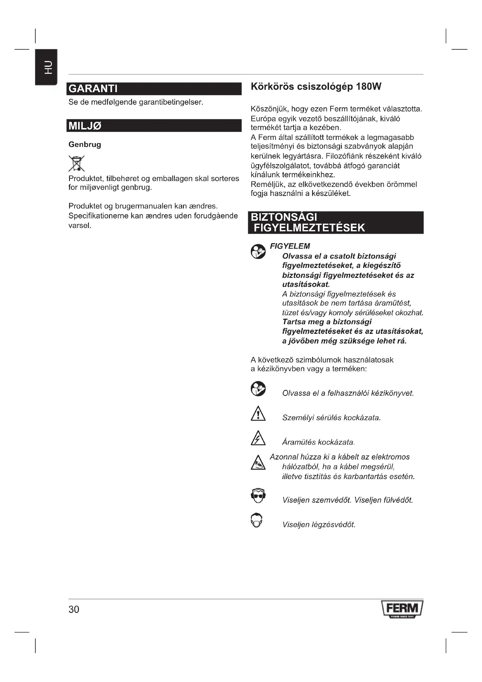 GARANTI Se de medfølgende garantibetingelser. MILJØ Genbrug Produktet, tilbehøret og emballagen skal sorteres for miljøvenligt genbrug. Produktetogbrugermanualenkanændres. Specikationernekanændresudenforudgående varsel. Körkörös csiszológép 180W Köszönjük,hogyezenFermterméketválasztotta. Európaegyikvezetőbeszállítójának,kiváló termékéttartjaakezében. AFermáltalszállítotttermékekalegmagasabb teljesítményiésbiztonságiszabványokalapján kerülneklegyártásra.Filozóánkrészekéntkiváló ügyfélszolgálatot,továbbáátfogógaranciát kínálunktermékeinkhez. Reméljük,azelkövetkezendőévekbenörömmel fogjahasználniakészüléket. BIZTONSÁGI FIGYELMEZTETÉSEK