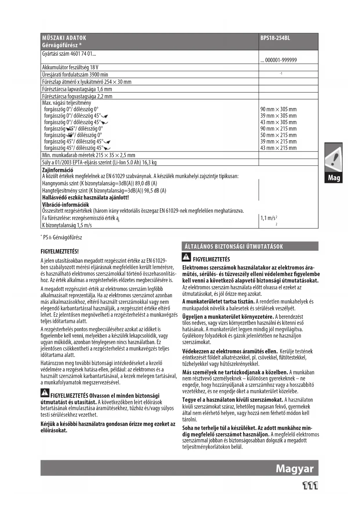 FIGYELMEZTETÉS Elektromos szerszámok használatakor az elektromos ára- mütés, sérülés- és tűzveszély elleni védelemhez gyelembe kell venni a következő alapvető biztonsági útmutatásokat. Az elektromos szerszám használata előtt olvassa el ezeket az útmutatásokat, és jól őrizze meg azokat. A munkaterületet tartsa tisztán. A rendetlen munkahelyek és munkapadok növelik a balesetek és sérülések veszélyét. Ügyeljen a munkaterület környezetére. A berendezést tilos nedves, vagy vizes környezetben használni és kitenni eső hatásának. A munkaterület legyen mindig jól megvilágítva. Gyúlékony folyadékok és gázok jelenlétében ne használjon szerszámokat. Védekezzen az elektromos áramütés ellen. Kerülje testének érintkezését földelt alkatrészekkel, pl. csövekkel, fűtőtestekkel, tűzhelyekkel vagy hűtőszekrényekkel. Más személyek ne tartózkodjanak a közelben. A munkában nem résztvevő személyeknek – különösen gyerekeknek – ne engedje, hogy hozzányúljanak a szerszámhoz vagy a hosszabbító vezetékhez, és ne engedje őket a munkaterület közelébe. Tegye el a használaton kívüli szerszámokat. A használaton kívüli szerszámokat száraz, lehetőleg magasan fekvő, gyermekek által nem elérhető helyen, vagy hozzá nem férhető módon kell tárolni. Soha ne terhelje túl a készüléket. Az adott munkához min- dig megfelelő szerszámot használjon. A megfelelő elektromos szerszámmal jobban és biztonságosabban dolgozik a megadott teljesítménykorlátokon belül.112 Mag A megfelelő szerszámot használja. Ne erőltesse a kis szerszámokat ipari szerszámmal végezhető feladat elvégzésére. Ne használja az elektromos szerszámot olyan célra, amelyre az nem való. Ne használjon például körfűrészt faágak vagy fahasábok vágásához. Viseljen megfelelő öltözetet. Ne viseljen bő ruhákat se ékszereket. A haját, ruháját és kesztyűjét tartsa biztonságos távolságban a mozgó alkatrészektől. Kültéri munkavégzéshez csúszásbiztos munkalábbelit ajánlunk. Hosszú haj esetén viseljen hajhálót. Használjon védőfelszerelést. Használjon védőszemüveget. Használjon arcvédő vagy porvédő maszkot, ha a munkaműveletek porképződéssel járnak. Mindig csatlakoztasson porelszívót. Ha lehetőség nyílik porszívó és porfogó felszerelése, győződjön meg róla, hogy azok csatlakoztatva lettek, és helyesen vannak használva. Soha ne használja nem rendeltetésszerűen a kábelt. A vil- lásdugót soha ne a hálózati vezetéknél fogva húzza ki az aljzatból. A vezetéket tartsa hőtől, olajtól és éles szélektől távol. Biztosítsa a munkadarabot. Használjon befogó eszközöket vagy satut a munkadarab rögzítéséhez. Így biztosabb a tartása, mint kézzel. Ne hajoljon ki túlságosan, és mindig őrizze meg egyensúlyát. Gondosan végezze el a szerszámok karbantartását. A jobb és biztonságosabb teljesítmény érdekében a szerszámok mindig legyenek megélezve és megtisztítva. Tartsa be a kenésre és a szerszámcserére vonatkozó útmutatásokat. Rendszeresen ellenőrizze az elektromos szerszám csatlakozó vezetékét, és annak sérülése esetén elismert szakemberrel cseréltesse ki azt. Rendszeresen ellenőrizze a hosszabbító vezetékeket, és cserélje ki őket, ha sérültek. A fogantyúkat tartsa szárazon, olajtól és zsírtól mentesen. Válassza le a szerszámokat a hálózatról. A szerszámokat válassza le az erősáramú hálózatról, amikor nem használja azokat, vagy szervizelés előtt és a tartozékok – vágólapok, fűrésztárcsák, szárak és vágólapok – behelyezése során. Vegye ki az állító kulcsokat és csavarkulcsokat. Alakítson ki olyan szokást, hogy a szerszám bekapcsolása előtt ellenőrzi, hogy az állító kulcsok és csavarkulcsok el vannak-e távolítva. Előzze meg a készülék nemkívánatos bekapcsolását. Ügyeljen rá, hogy az akkumulátor behelyezésekor a kapcsoló „ki” (o) állásban legyen. Kültéri hosszabbítót használjon. Ha elektromos szerszámmal dolgozik a szabadban, csak olyan hosszabbító kábelt használjon, amelynek kültéri használata megengedett, és ennek megfelelő jelöléssel rendelkezik. Őrizze meg éberségét. Figyeljen oda arra, amit csinál, használja a józan ítélőképességét és ne használja a szerszámot, ha fáradt. Használat előtt alaposan ellenőrizze, hogy nincs-e sérülés vagy anyagkifáradás a szerszámon. Ellenőrizze a mozgó alka- trészek beállítását, a mozgó alkatrészek rögzítését, az alkatrészek esetleges törését, és szerszám működését befolyásoló minden más körülményt. Ne használja a gépet, ha a védőburkolatok nincsenek a helyükön és nem működnek megfelelően. A sérüléseket azonnal javíttassa meg arra jogosult szakműhelyben. Ne használja a szerszámot, ha a kapcsolóval nem lehet be- és kikapcsolni. FIGYELMEZTETÉS A jelen használati utasításban ajánlottaktól eltérő bármely más tartozék vagy toldat használata személyi sérülés kockázatával jár. Elektromos szerszámát villamossági szakemberrel javít- tassa meg. Ez az elektromos szerszám megfelel a vonatkozó biz- tonsági rendelkezéseknek. Javításokat csak villamossági szakember végezhet, melynek során eredeti alkatrészek használandóak; egyéb esetben a felhasználó balesetet szenvedhet. BIZTONSÁGI UTASÍTÁSOK A GÉRVÁGÓ FŰRÉSZ